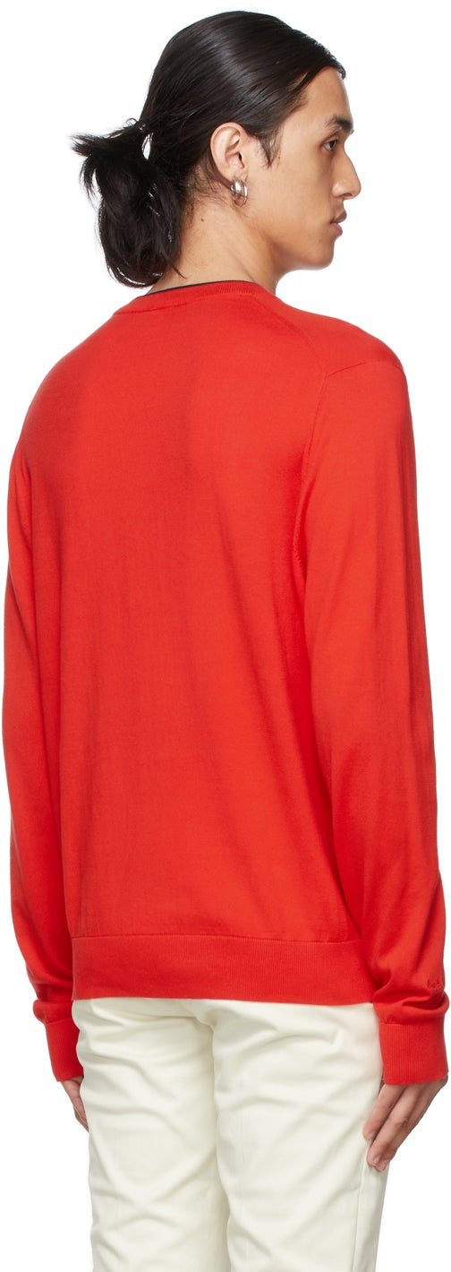 Long sleeve cotton jersey sweatshirt in red. Rib knit cuffs, crewneck collar, and hem. Navy stripe knit at collar. Logo embroidered in white at cuff. Supplier color: Red 100% cotton. Brand: Paul Smith