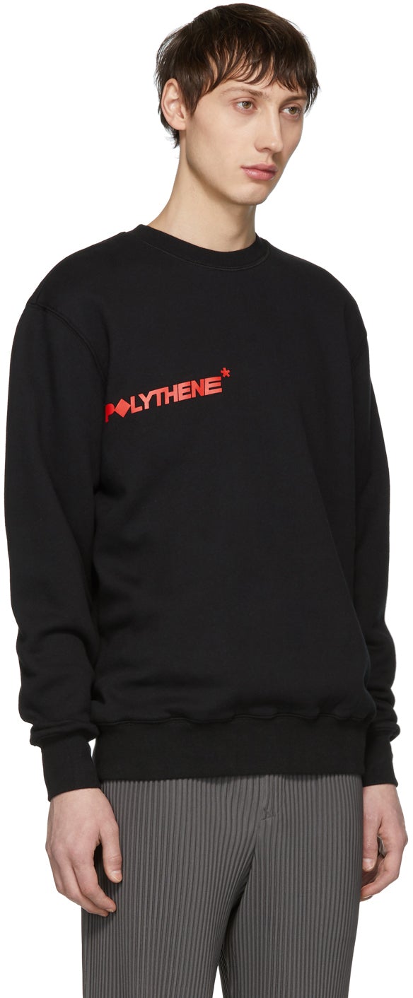 Long sleeve cotton-blend fleece sweatshirt in black. Rib knit crewneck collar, cuffs, and hem. Logo printed in red at chest and back. Tonal stitching. 72% cotton, 28% polyester. Brand: Polythene* Optics