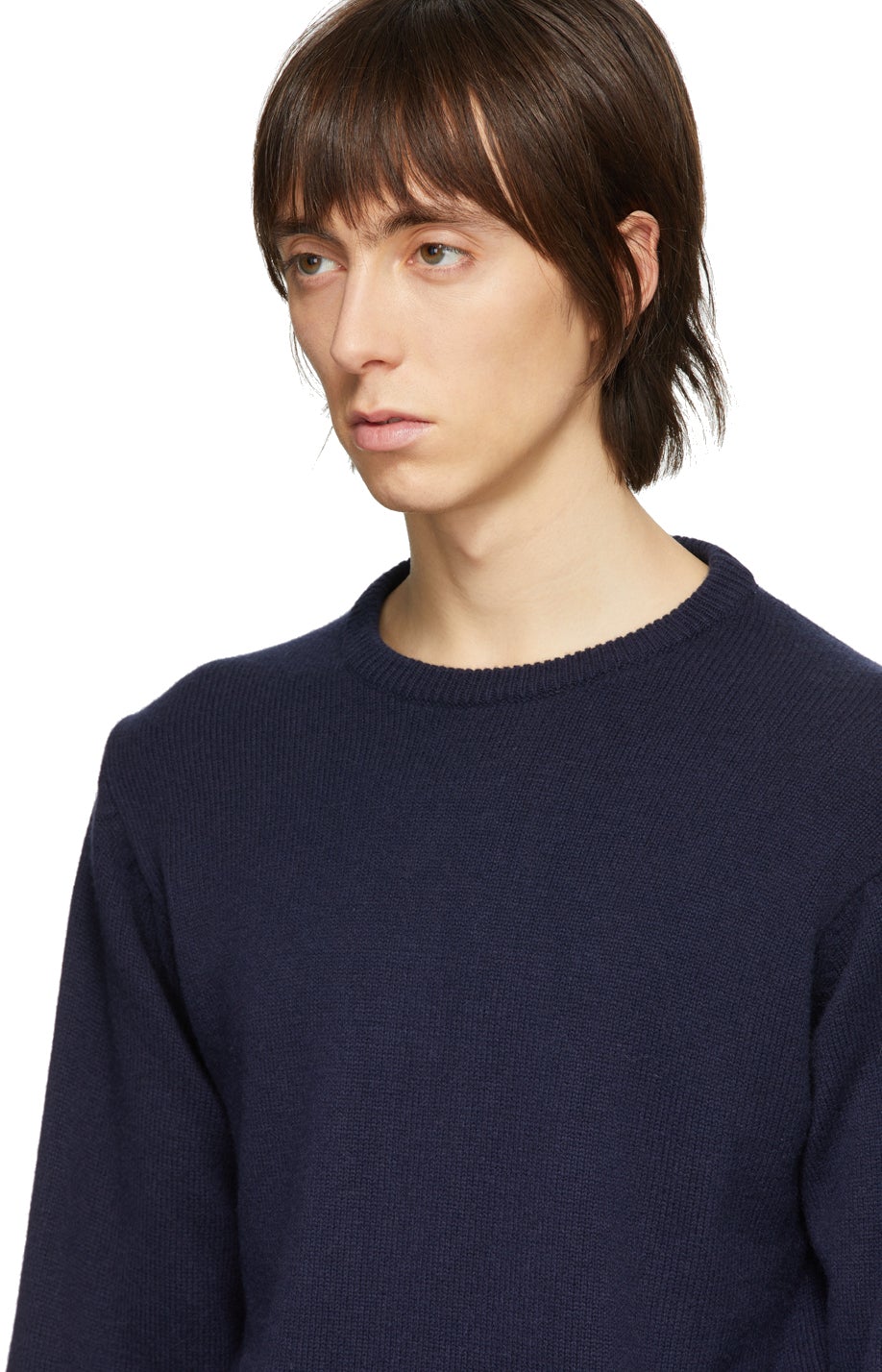 Long sleeve knit cashmere and merino-wool blend sweater in navy. Rib knit crewneck collar and hem. Rib knit cuffs in black. Supplier color: Navy 50% cashmere, 50% merino wool. Brand: Random Identities