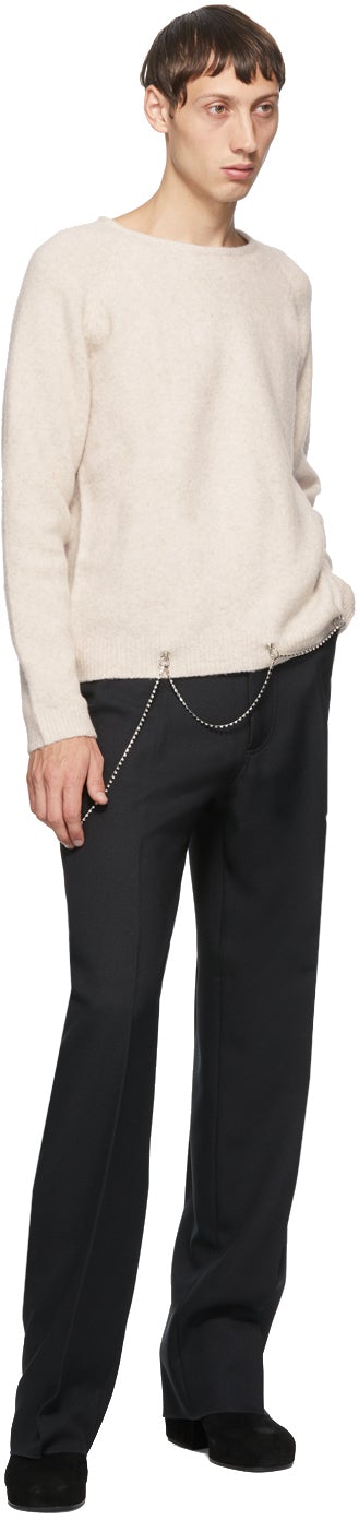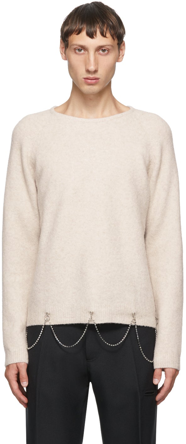 Long sleeve wool and yak wool-blend sweater in pink. Rib knit crewneck collar, cuffs, and hem. Chain hardware with crystal-cut detailing at hem. Silver-tone hardware. Supplier color: Pink 54% wool, 22% yak, 19% nylon, 5% elastane. Brand: Random Identities