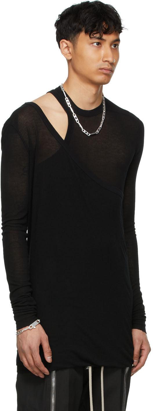 Single-sleeve rib knit viscose and silk-blend sweater in black. Layered construction. Rib knit crewneck collar. Single-shoulder long sleeve T-shirt-style overlay. Supplier color: Black 88% viscose, 12% silk. Brand: Rick Owens