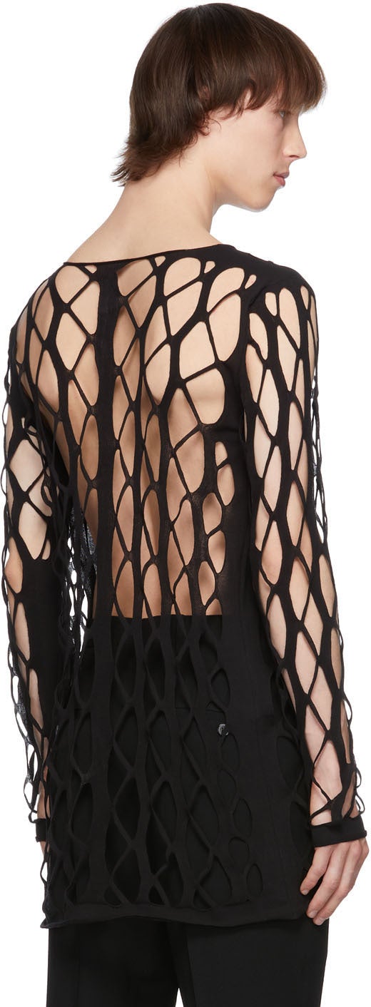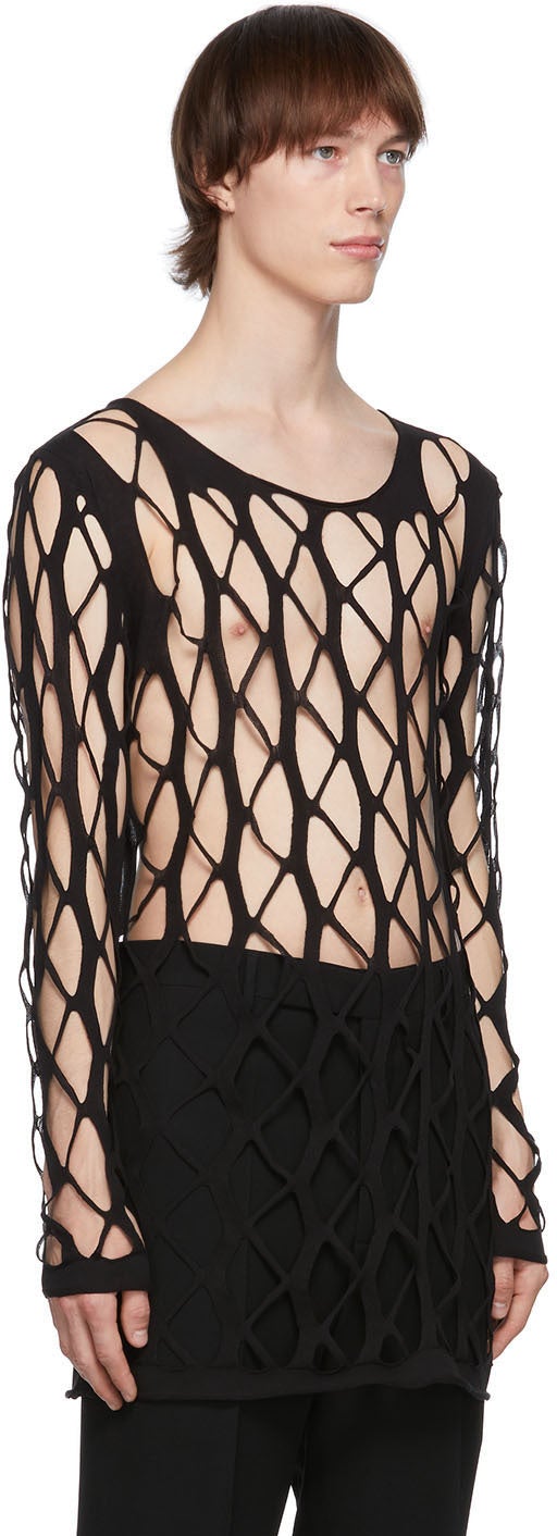 Long sleeve rib knit cotton mesh sweater in black. Crewneck collar. Supplier color: Black 100% cotton. Brand: Rick Owens