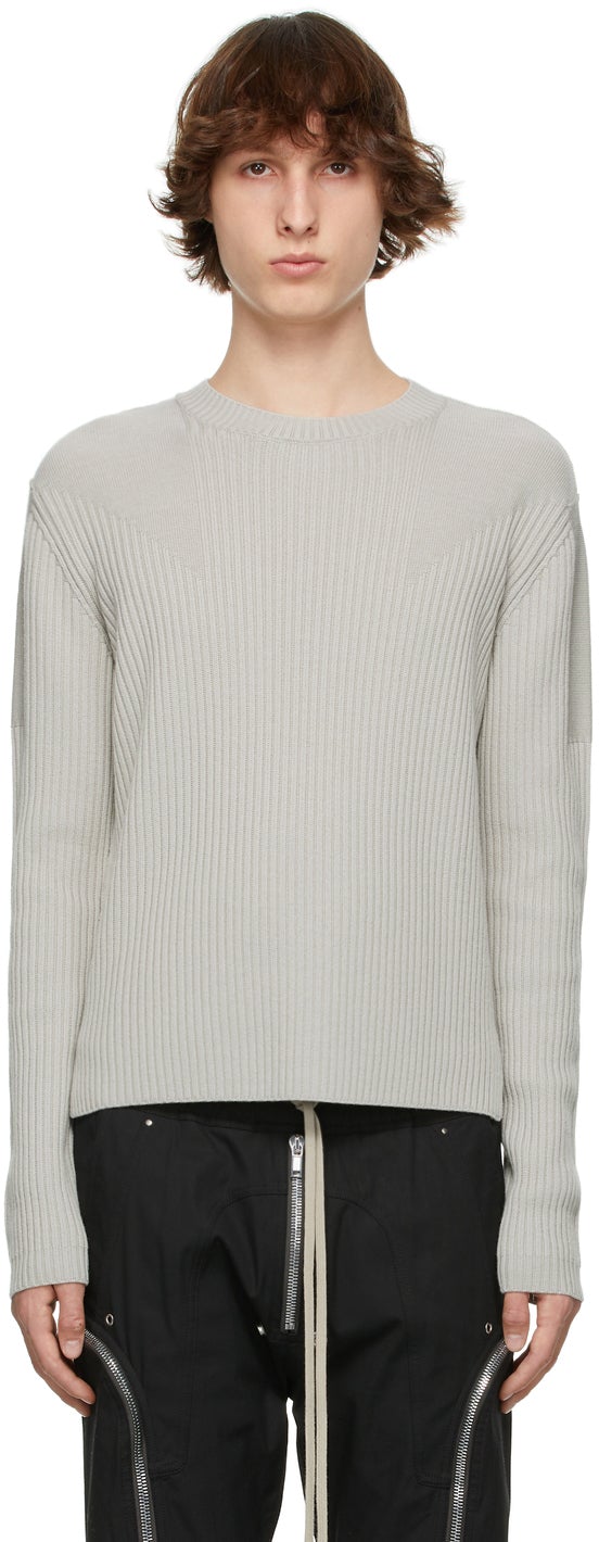 Long sleeve knit virgin wool sweater in grey. Rib knit detailing throughout. Crewneck collar. Vented side-seams. Supplier color: Oyster 100% virgin wool. Brand: Rick Owens
