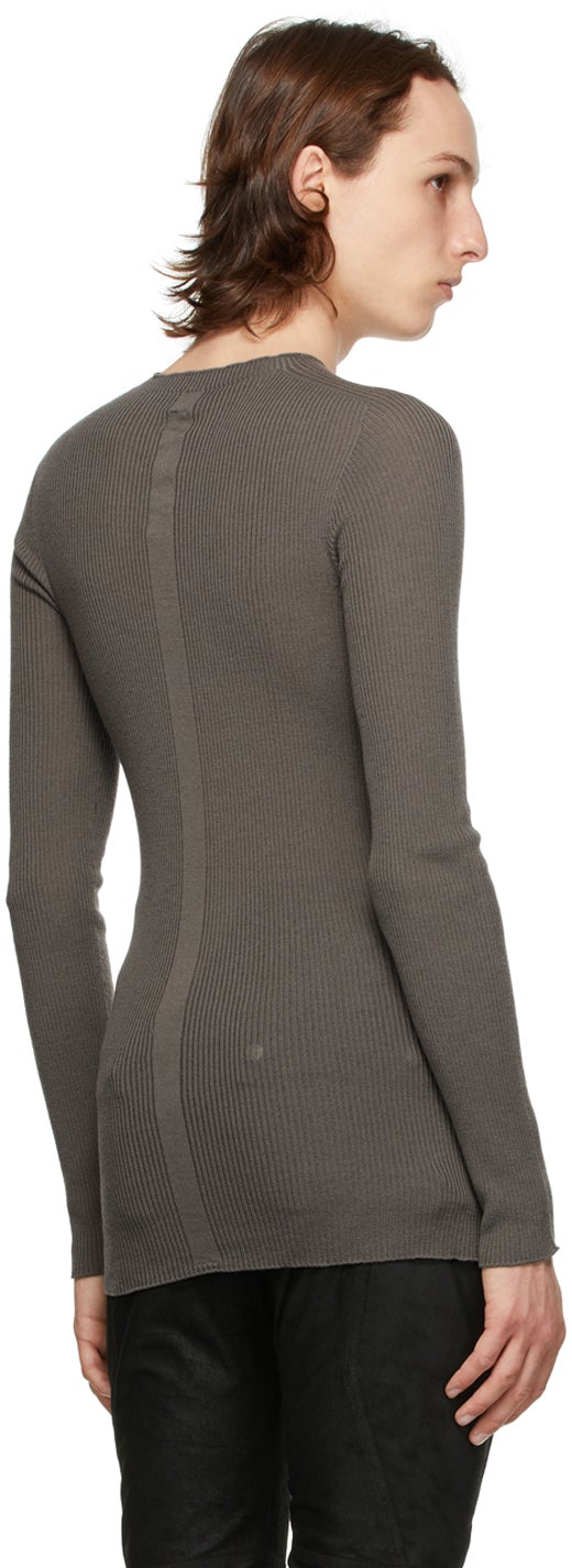 Long sleeve knit virgin wool sweater in grey. Rib knit crewneck collar. Supplier color: Dust 100% virgin wool. Brand: Rick Owens