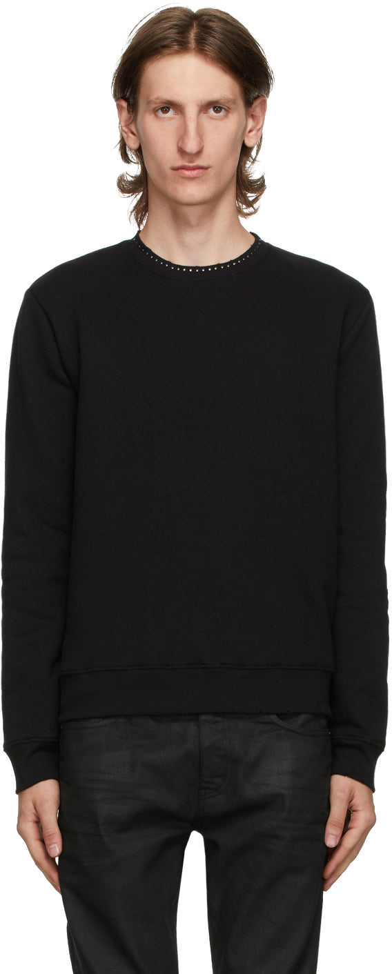 Long sleeve cotton fleece sweatshirt in black. Distressing throughout. Stud detailing at rib knit crewneck collar. Rib knit cuffs and hem. Gunmetal-tone hardware. Supplier color: Black 100% cotton. Brand: Saint Laurent