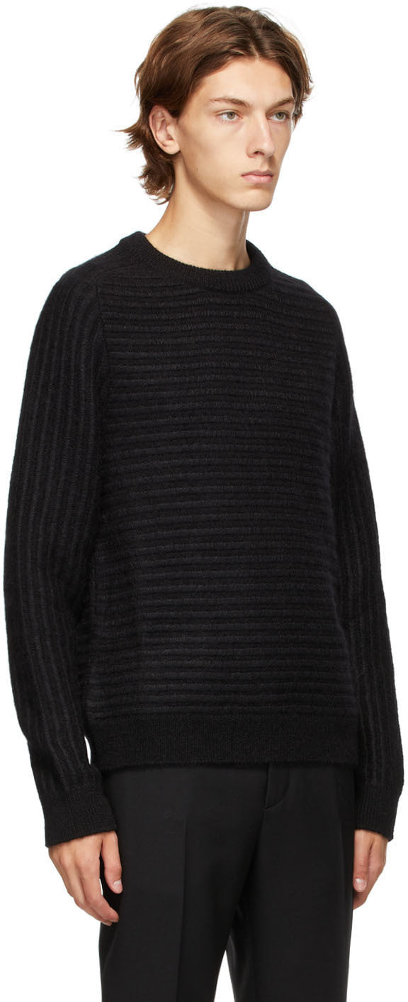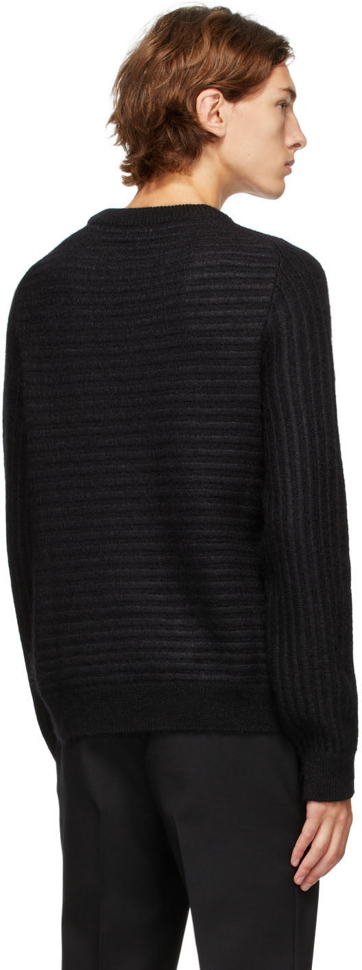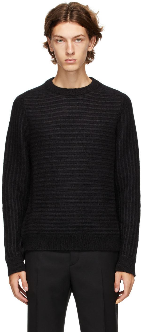 Long sleeve rib knit wool and mohair-blend sweater in black. Rib knit crewneck collar, cuffs, and hem. Saddle shoulders. Supplier color: Black 65% wool, 23% mohair, 11% polyamide. Brand: Saint Laurent