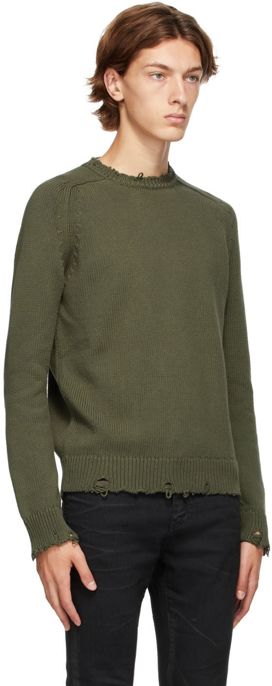 Long sleeve knit cotton sweater in khaki. Distressing at rib knit crewneck collar, cuffs, and hem. Raglan sleeves. Supplier color: Khaki 100% cotton. Brand: Saint Laurent