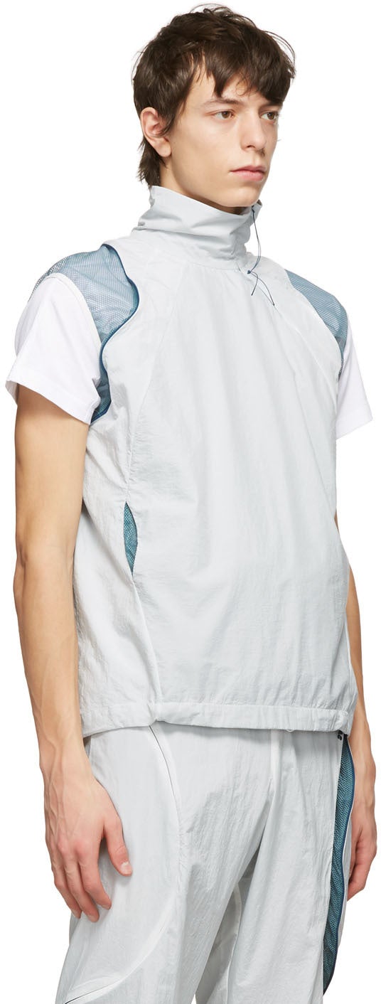 Long sleeve nylon taffeta sweatshirt in white. Stand collar. Asymmetric half-zip closure at front. Logo bonded in blue and welt pockets at waist. Drawstring at hem. Zippered vent at raglan sleeves. Elasticized cuffs. Rain shield at back. Full mesh lining in blue. Blue hardware. Supplier color: White/Petrol Body: 100% nylon. Lining: 100% polyester. Brand: Saul Nash