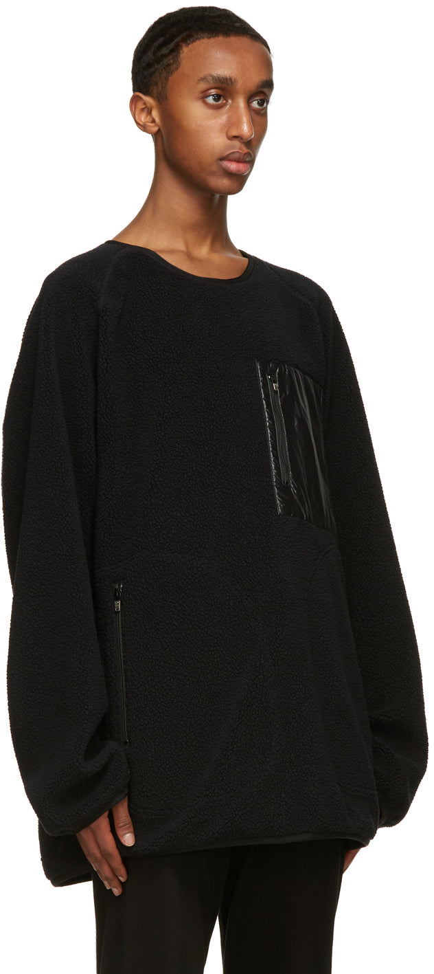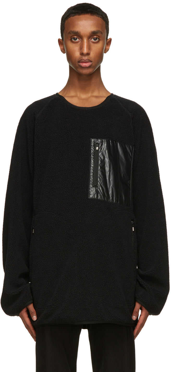 Long sleeve fleece sweatshirt in black. Tonal elasticized trim at rib knit collar, cuffs, and hem. Zippered satin pocket at chest. Zippered pockets at waist. Cut-outs at waist. Press-stud tabs at back collar. Press-stud tabs at back for alternate styling. Zippered pockets at back. Unlined. Tonal and silver-tone hardware. Supplier color: Black Body: 100% polyester. Trim: 100% nylon. Brand: TAKAHIROMIYASHITA TheSoloist.