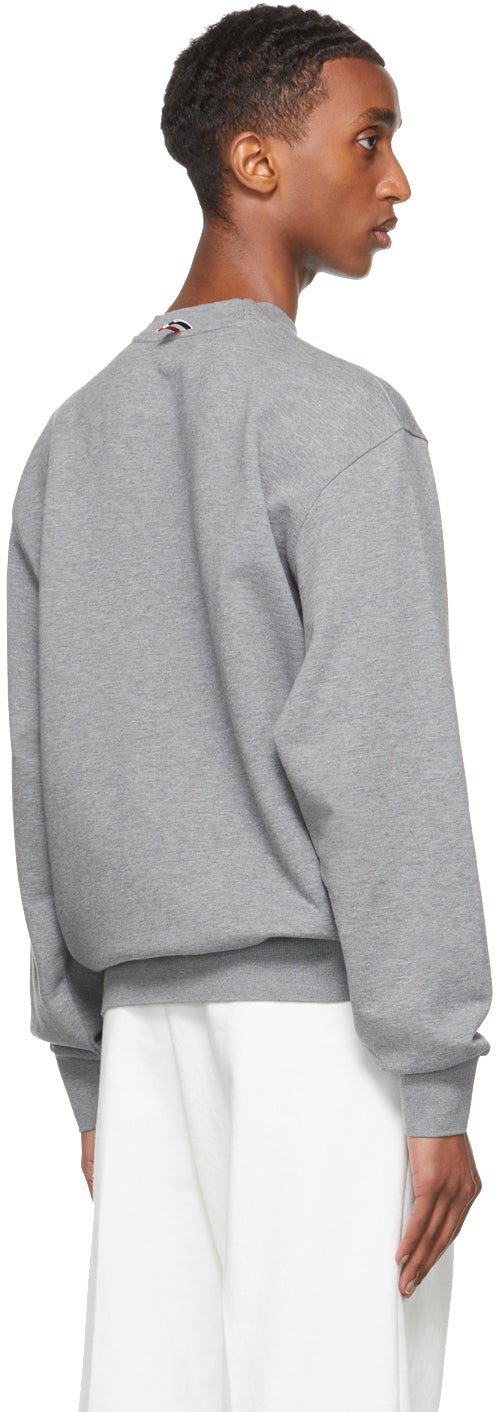 Long sleeve French terry sweatshirt in grey. Jacquard knit signature stripes in white at rib knit mock neck collar. Rib knit cuffs and hem. Signature tricolor grosgrain flag at back collar. Supplier color: Medium grey Body: 100% cotton. Trim: 97% cotton, 3% elastane. Brand: Thom Browne