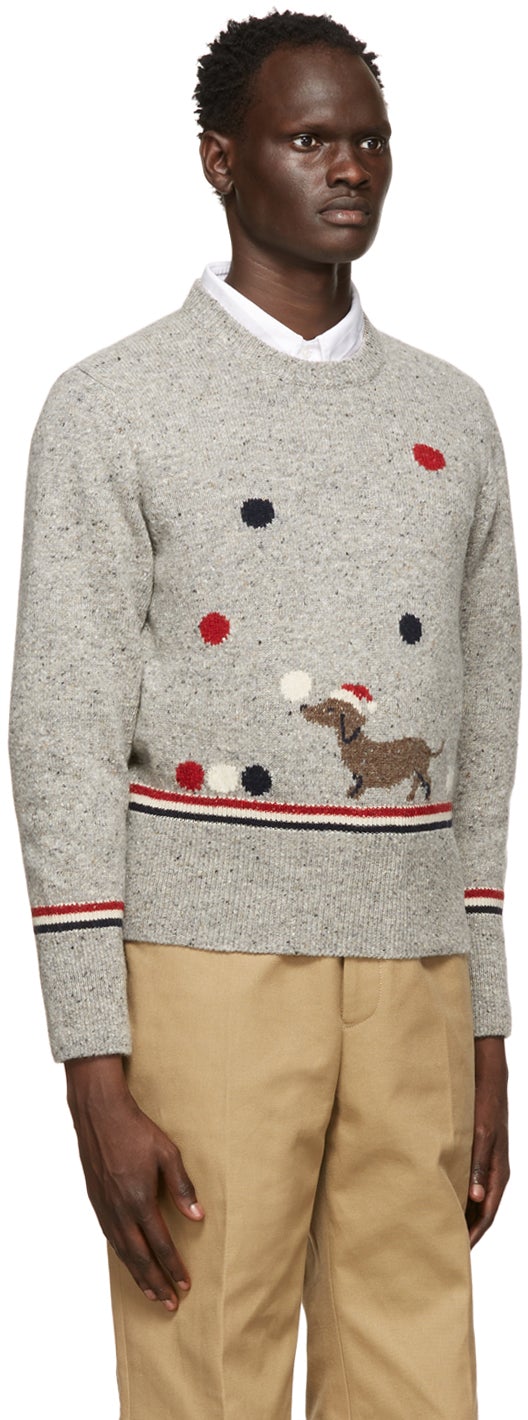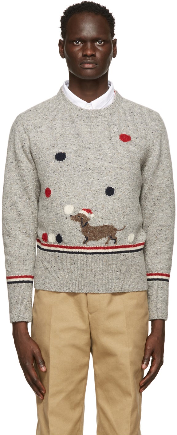 Long sleeve knit wool and mohair-blend sweater marled in tones of grey, navy, and beige. Rib knit crewneck collar, cuffs, and hem. Intarsia knit polka dots and graphic in multicolor at front. Intarsia knit signature tricolor stripes at cuffs and hem. Signature tricolor grosgrain flag at back collar. Supplier color: Light grey 70% wool, 30% mohair. Brand: Thom Browne