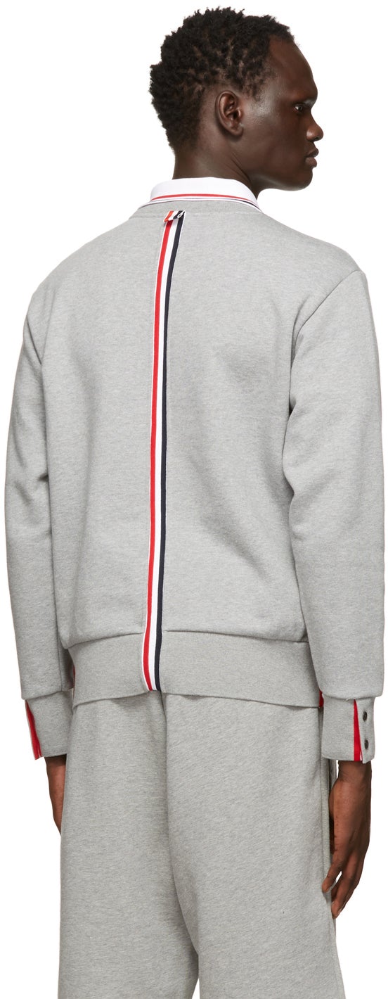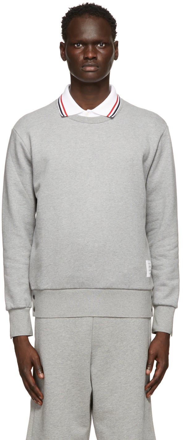 Long sleeve French terry sweatshirt in grey. Rib knit crewneck collar, cuffs, and hem. Textile logo patch at front hem. Buttoned vent featuring concealed signature tricolor trim at cuffs and side-seams. Signature tricolor grosgrain flag and trim at back. Tonal hardware. Supplier color: Light grey Body: 100% cotton. Trim 1: 100% cotton. Trim 2: 97% cotton, 3% elastane. Brand: Thom Browne