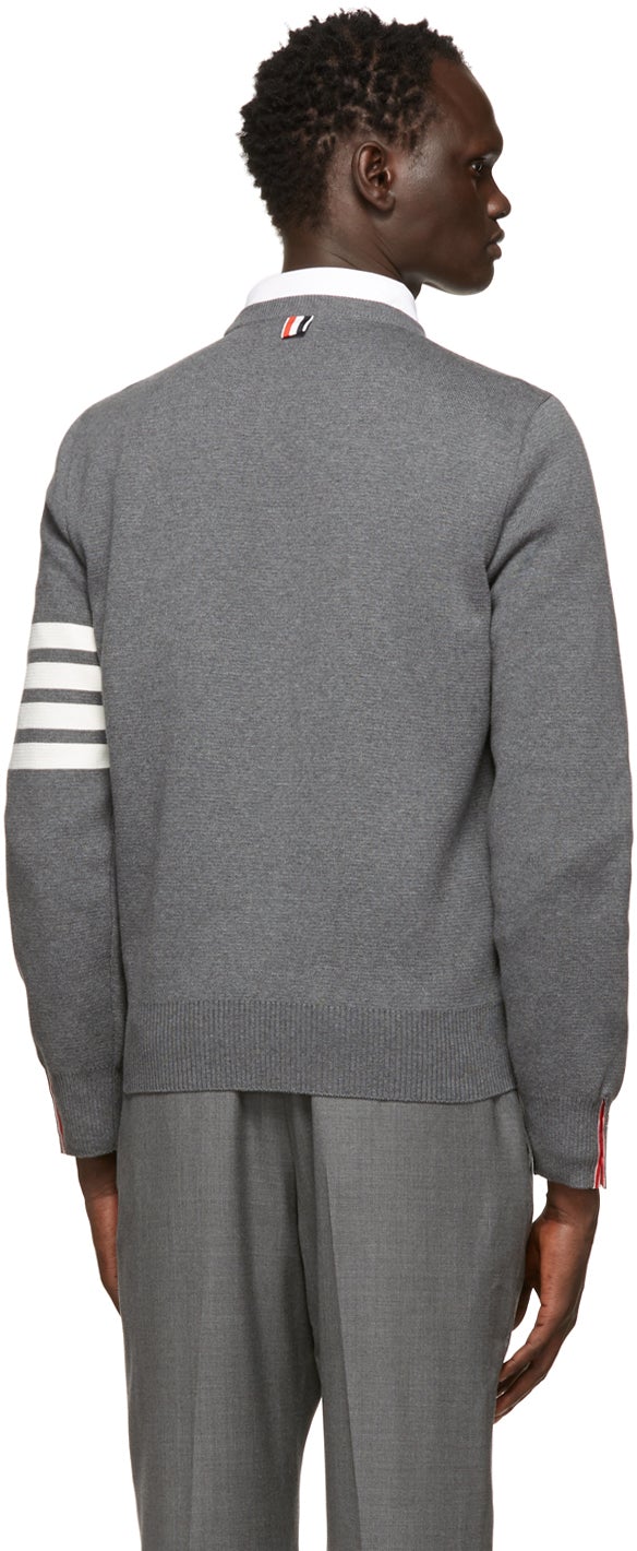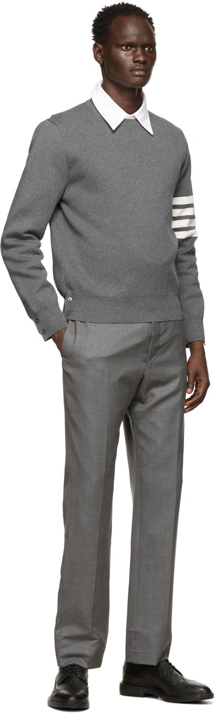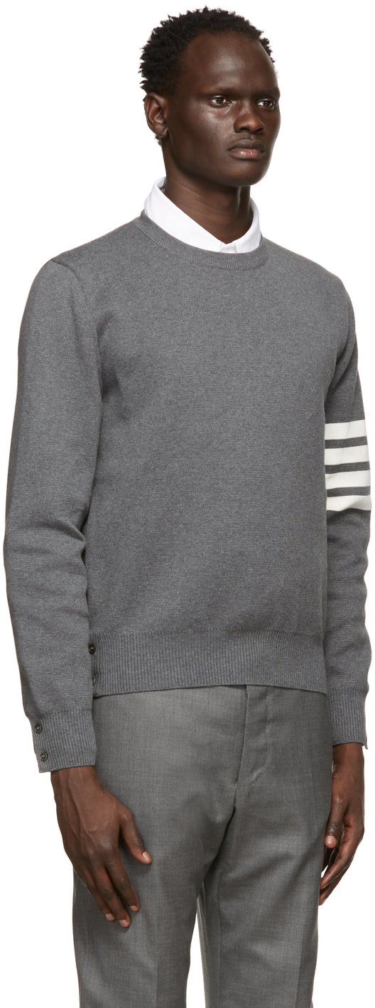 Long sleeve Milano stitch knit cotton sweater in grey. Rib knit crewneck collar, cuffs, and hem. Signature stripes in white at sleeve. Buttoned vent featuring concealed signature tricolor trim at cuffs and side-seams. Signature tricolor grosgrain flag at back collar. Supplier color: Medium grey 100% cotton. Brand: Thom Browne