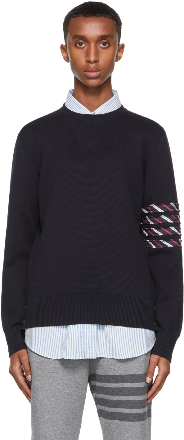 Long sleeve Milano stitch knit cotton sweater in navy. Rib knit crewneck collar, cuffs, and hem. Silk signature stripe appliqués striped in navy, white, and red at sleeve. Buttoned vent featuring concealed signature tricolor trim at cuffs and hem. Signature tricolor grosgrain flag at back collar. Mother-of-pearl hardware. Supplier color: Navy 100% cotton. Brand: Thom Browne