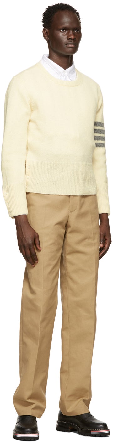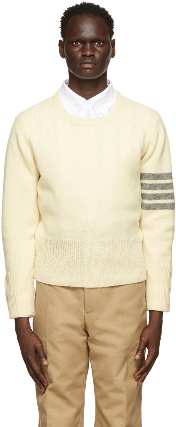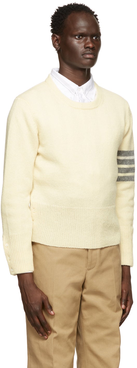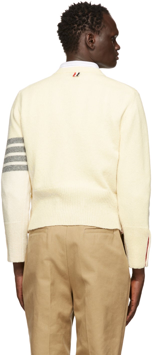 Long sleeve knit Shetland wool sweater in off-white. Rib knit crewneck collar, cuffs, and hem. Signature stripes knit in grey at sleeve. Buttoned vent featuring concealed signature tricolor trim at cuffs and side-seams. Signature tricolor grosgrain flag at back. Tonal hardware. Supplier color: White 100% wool. Brand: Thom Browne