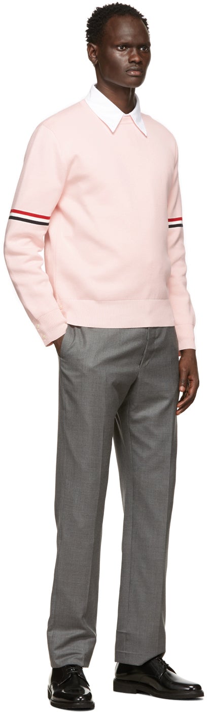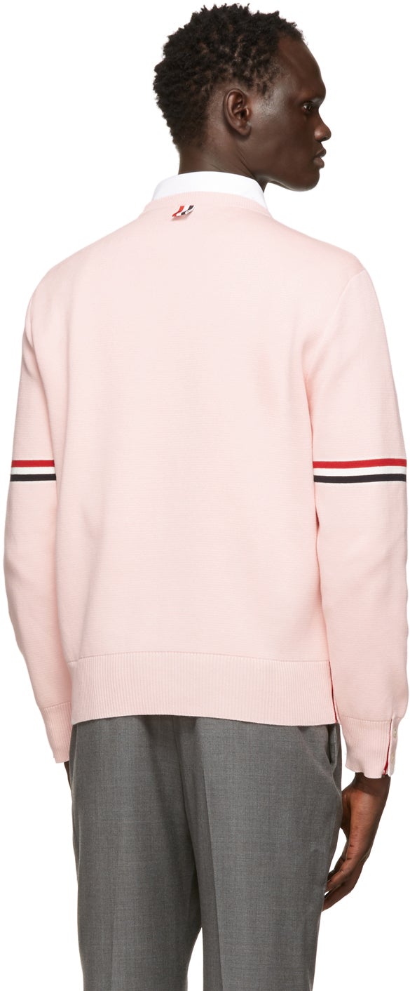 Long sleeve Milano stitch knit cotton sweater in pink. Rib knit crewneck collar, cuffs, and hem. Intarsia knit signature tricolor stripes at sleeves. Buttoned vent featuring concealed signature tricolor trim at cuffs and side-seams. Signature tricolor grosgrain flag at back collar. White hardware. Supplier color: Light pink 100% cotton. Brand: Thom Browne