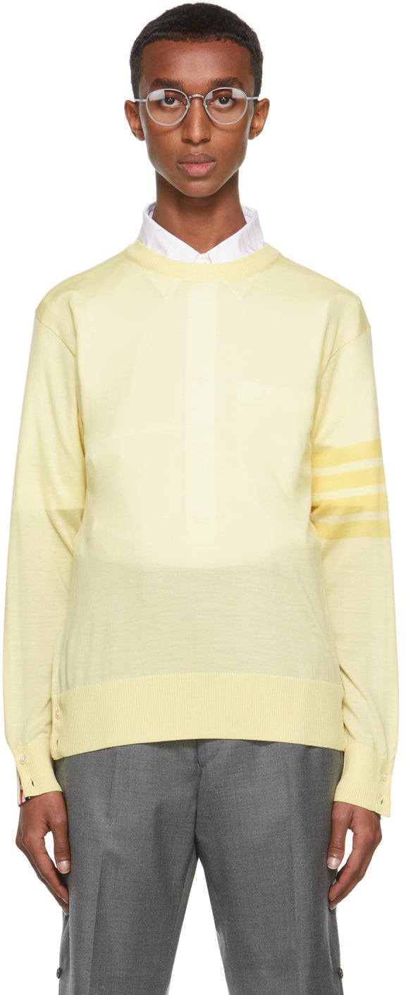 Long sleeve merino wool jersey sweater in yellow. Rib knit crewneck collar, cuffs, and hem. Intarsia knit tonal signature stripes at sleeve. Buttoned vent featuring concealed signature tricolor grosgrain trim at cuffs and side-seams. Signature tricolor grosgrain flag at back collar. Supplier color: Yellow 100% merino wool. Brand: Thom Browne