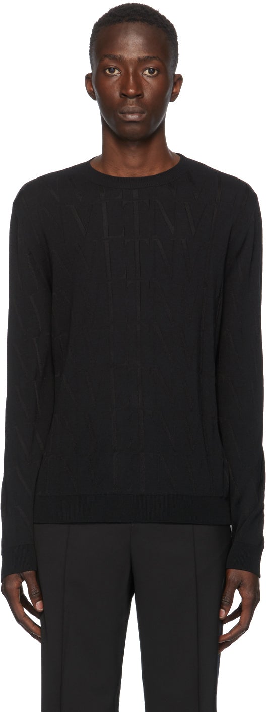 Long sleeve knit virgin wool-blend sweater in black featuring tonal woven logo pattern throughout. Rib knit crewneck collar, cuffs, and hem. Supplier color: Black 53% virgin wool, 47% viscose. Brand: Valentino