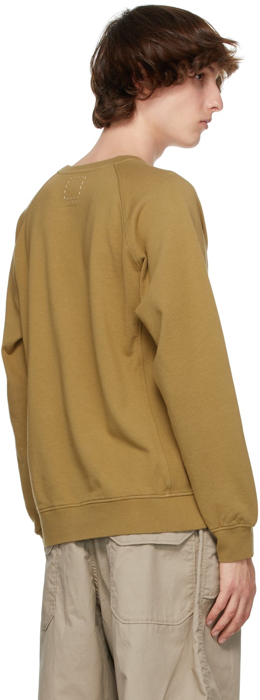 Long sleeve French terry sweatshirt in khaki. Rib knit crewneck collar, cuffs, side-seams, and hem. Raglan sleeves. Hand-stitched accent in off-white at back collar. Supplier color: Khaki 100% cotton. Brand: Visvim