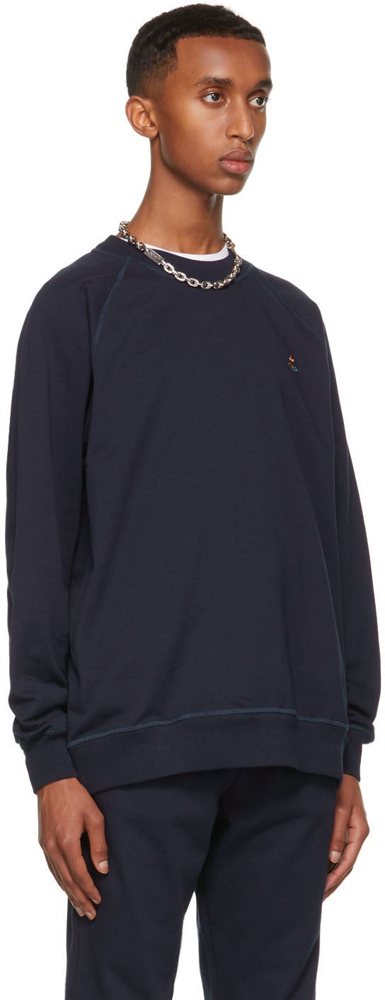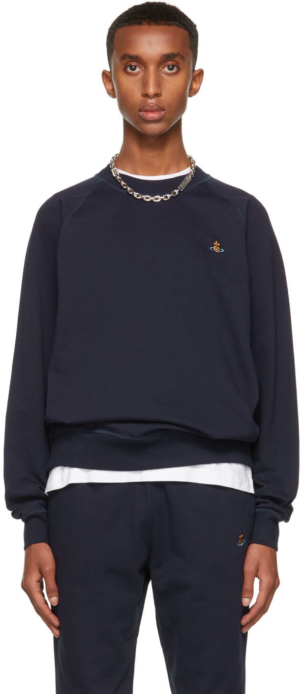 Long sleeve French terry sweatshirt in navy. Rib knit crewneck collar, cuffs, and hem. Logo graphic embroidered in multicolor at chest. Raglan sleeves. Supplier color: Navy 100% cotton. Brand: Vivienne Westwood