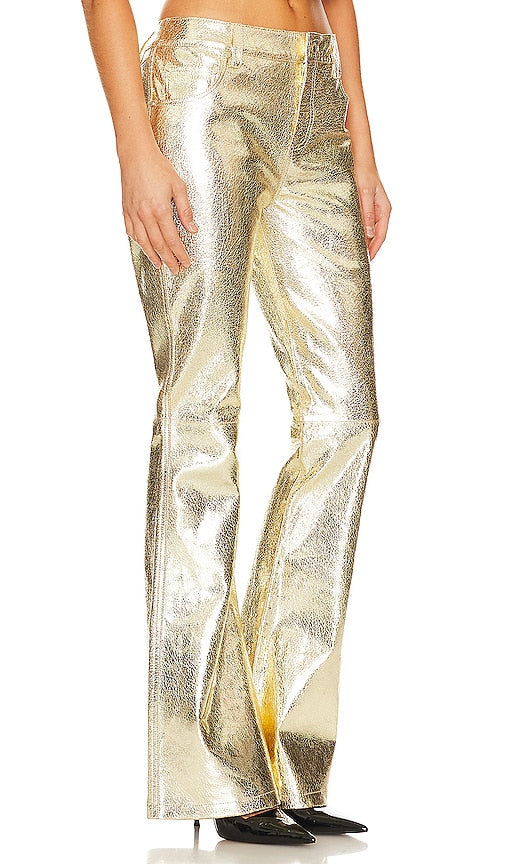 retrofete Lynx Leather Pant in Metallic Gold. - size L (also in M, XL) retrofete Lynx Leather Pant in Metallic Gold. - size L (also in M, XL) 100% leather. Made in India. Professional leather clean only. Zip fly with button closure. 5-pocket design. Crackled metallic leather fabric. 14 at the knee breaks to 20 at the leg opening. ROFR-WP53. HL23-6366. Retrofete, launched in 2018 by co-founders Ohad Seroya and Aviad Klin, embodies the glamour and opulence of decades past. Having gained notoriety for its sequin-clad party frocks, the New York-based label has evolved into a collection of daring, top-to-toe designs that seamlessly transform from day to night. Regardless of where she goes, you can count on the Retrofete girl to bring the party. Shop the latest in fashion from retrofete