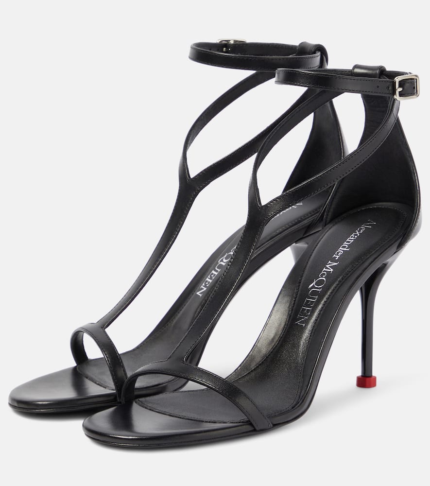 Upper: leather. Lining: leather. Sole: leather insole, leather and rubber sole. Toe shape: almond open toe. Made in Italy. Includes: extra heel tips, dust bag, shoe box. Designer color name: Black/Lust Red. Closure: buckle-fastening ankle strap. Shop the latest Alexander McQueen High-Heel Sandals for women now.
