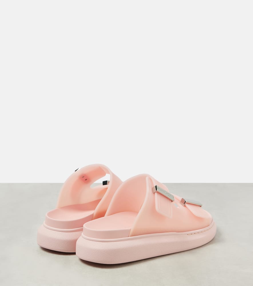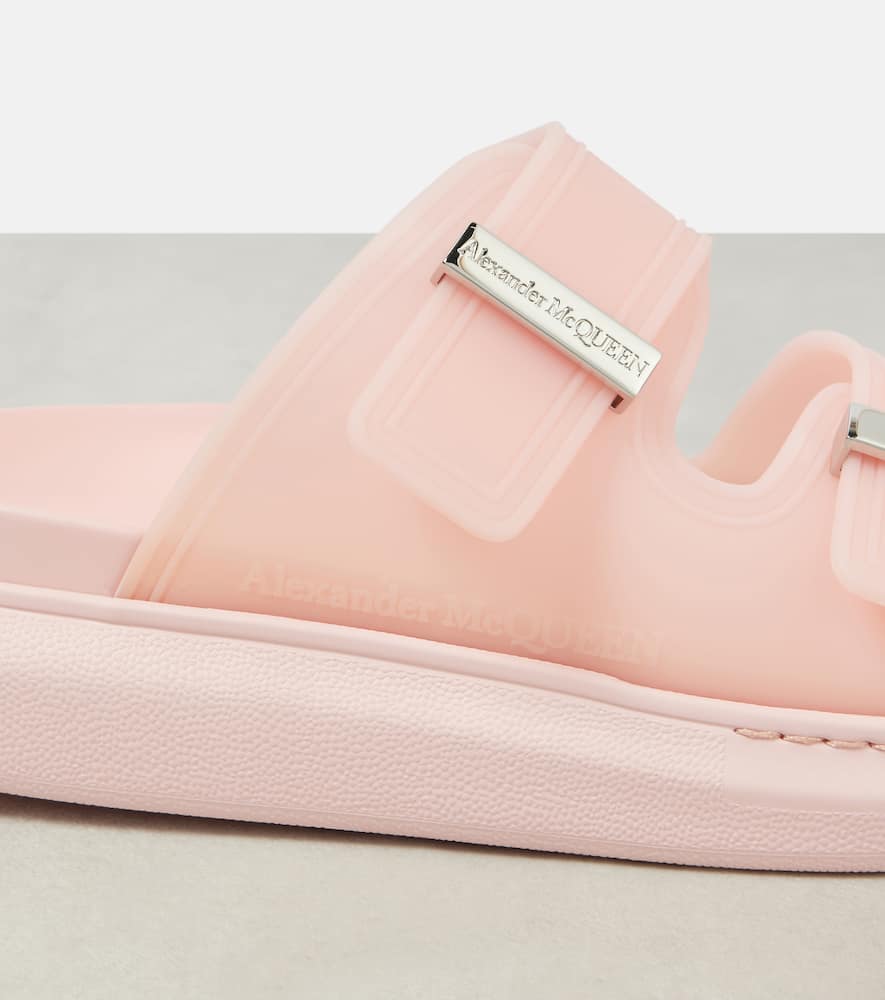Upper: rubber. Lining: rubber. Sole: rubber insole and sole. Toe shape: round open toe. Made in Italy. Includes: dust bag. Designer color name: Che.Blo.Pink/Silver. Shop the latest Alexander McQueen Slides for women now.