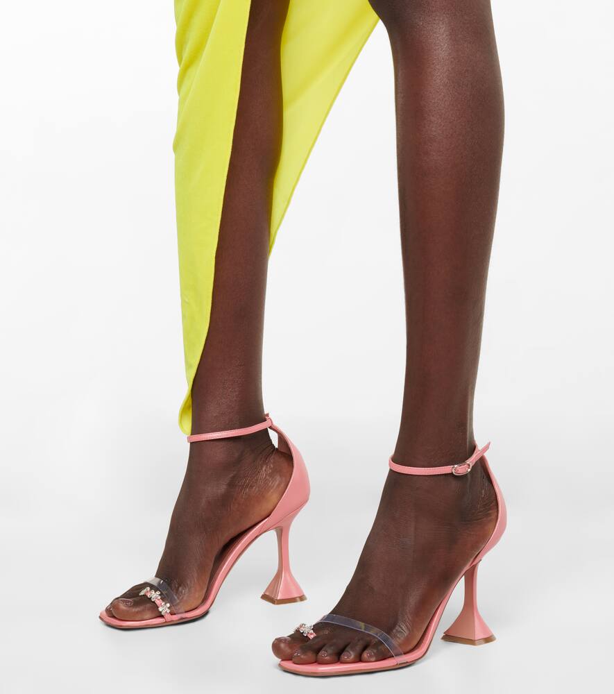Trim: crystals. Upper: plastic, fabric, leather. Sole: leather insole, leather and rubber sole. Lining: fabric, plastic. Made in Italy. Designer color name: Pink. Comes with dust bag, Comes with a box. Toe shape: square open toe. Shop the latest Amina Muaddi High-Heel Sandals for women now.
