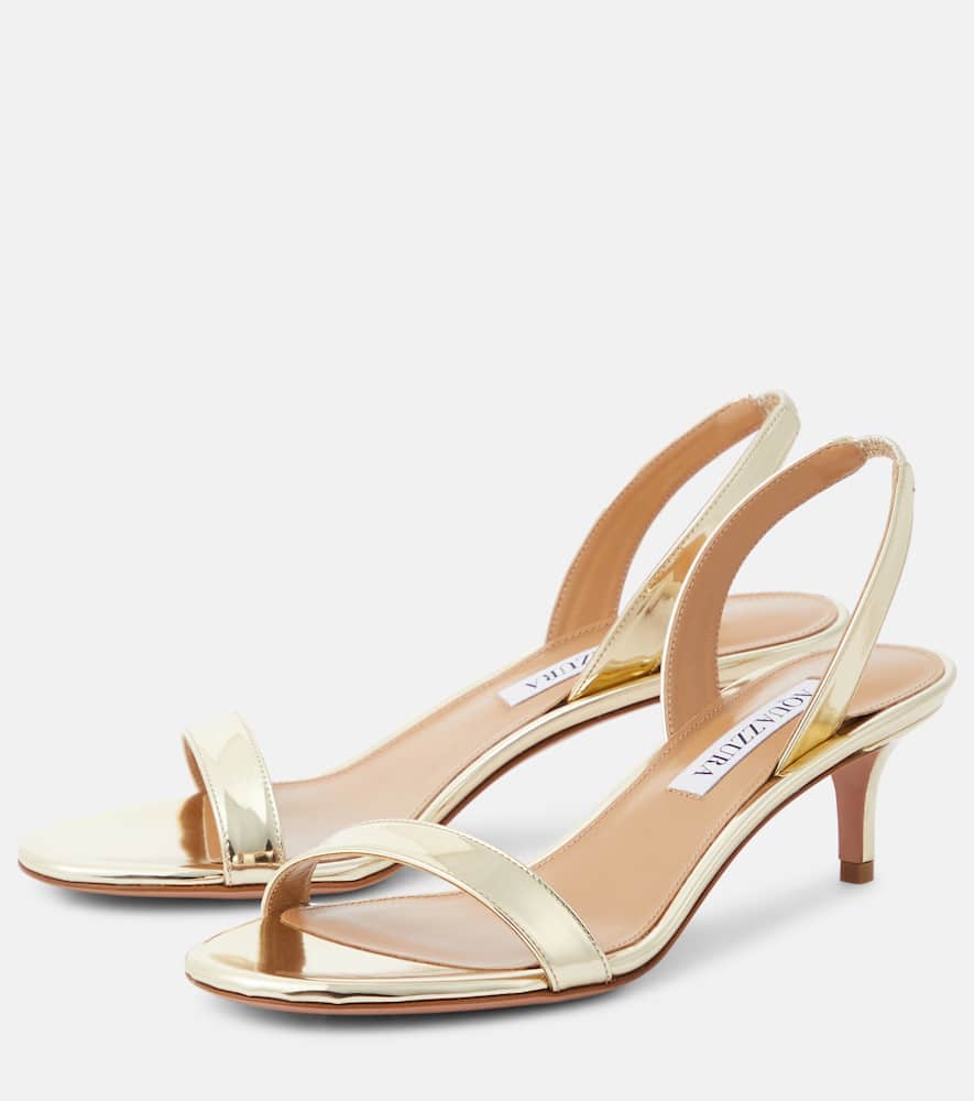 Upper: leather. Lining: leather. Sole: leather insole and sole. Toe shape: round open toe. Made in Italy. Includes: dust bags, shoe box. Designer color name: Soft Gold. Hardware color: gold. Closure: elasticated strap. Shop the latest Aquazzura Mid-Heel Sandals for women now.