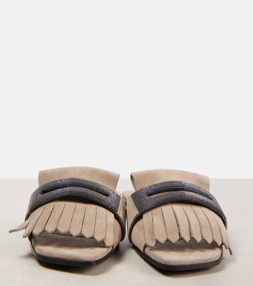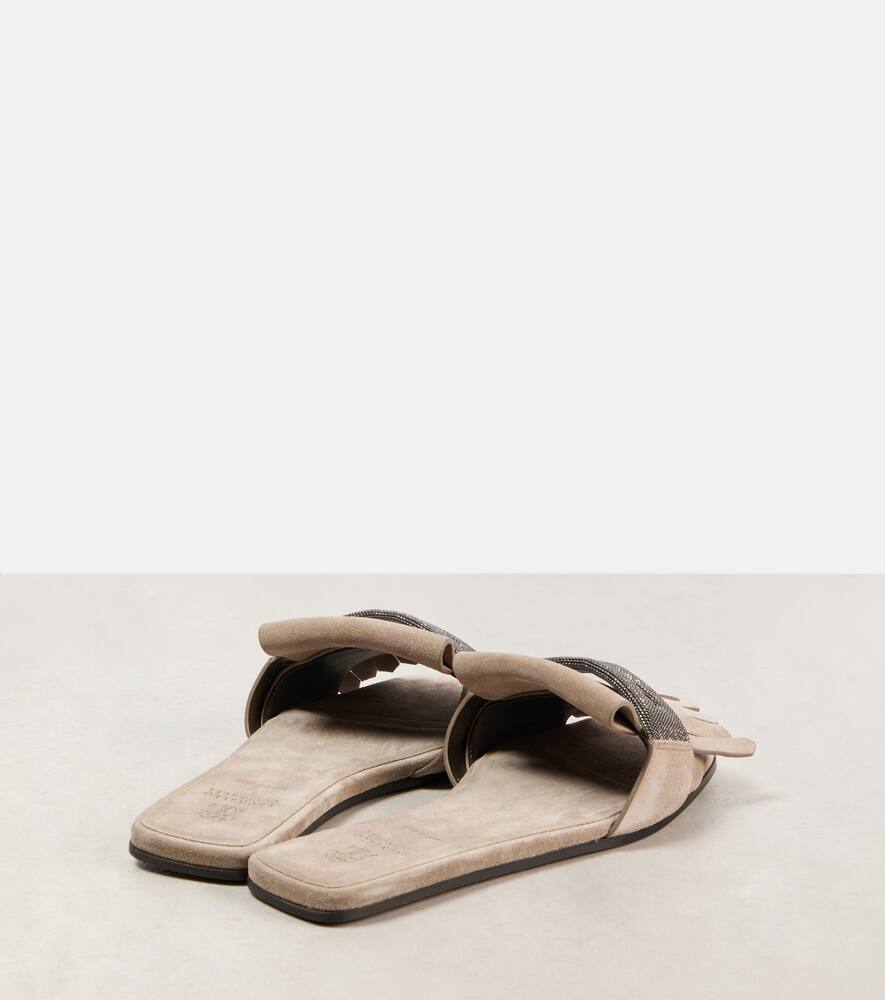 Upper: leather. Lining: leather. Sole: leather insole, leather and rubber sole. Toe shape: square open toe. Made in Italy. Includes: shoe box, dust bags. Designer color name: Ice. Shop the latest Brunello Cucinelli Luxe Lounge Flats for women now.