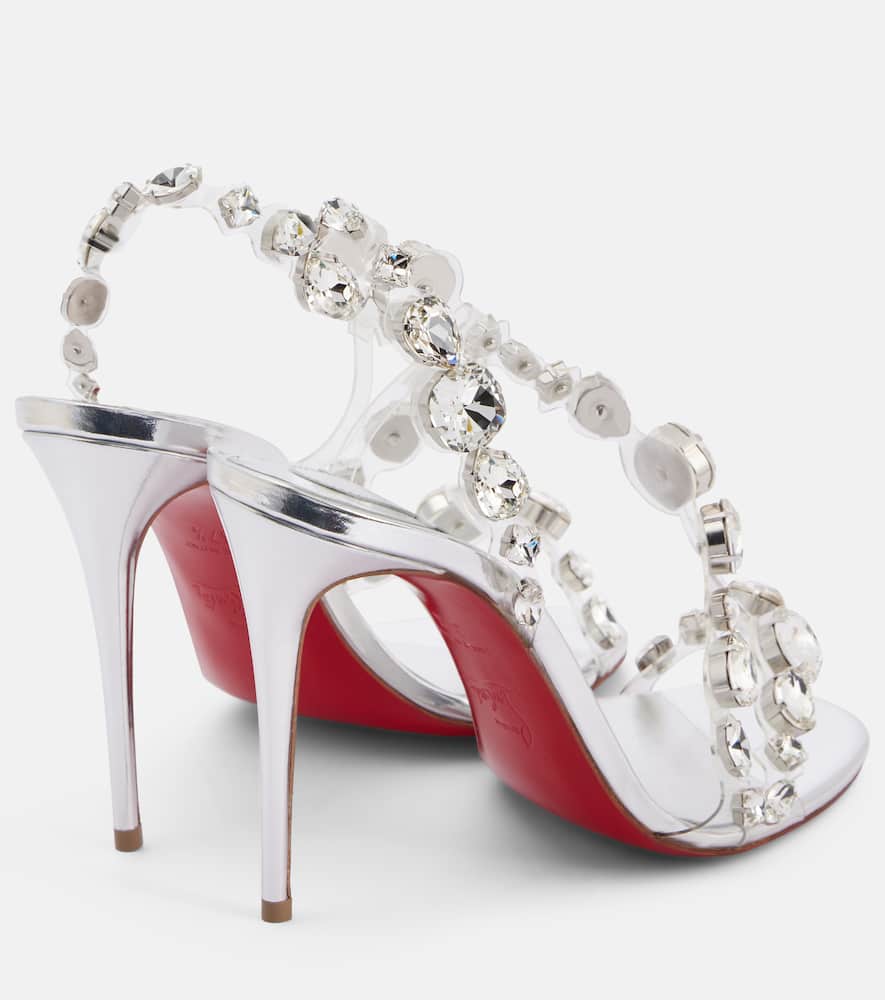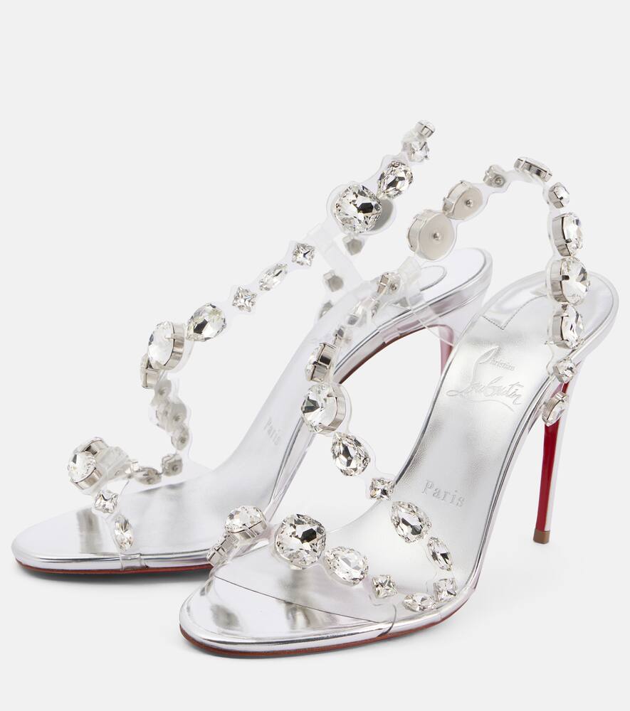 Upper: polyvinyl chloride. Lining: polyvinyl chloride. Sole: leather insole, signature red leather sole. Toe shape: round open toe. Made in Italy. Includes: shoe box, dust bags. Designer color name: Crystal/Silv/Lin Sv. Hardware color: silver. Shop the latest Christian Louboutin High-Heel Sandals for women now.