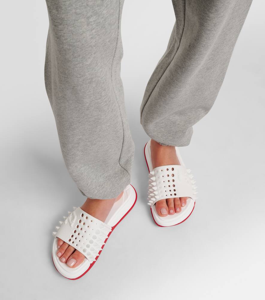 Upper: rubber. Lining: rubber. Sole: rubber insole and sole. Toe shape: round open toe. Made in Italy. Includes: shoe box, dust bags. Designer color name: White. Shop the latest Christian Louboutin Slides for women now.