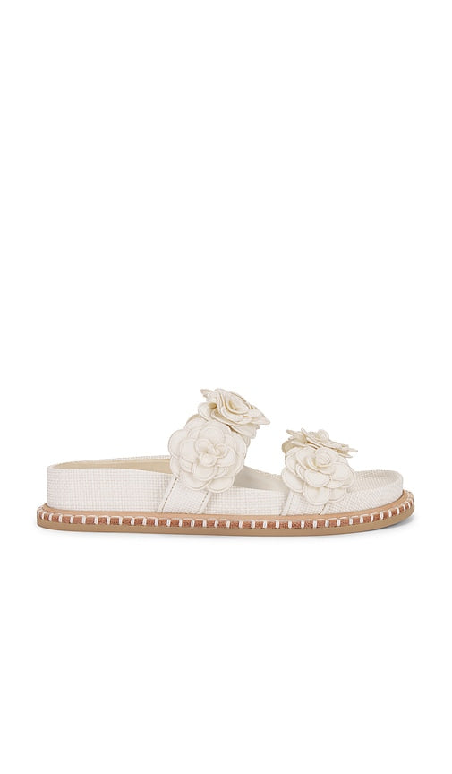 Textile upper with rubber sole. Imported. Slip-on styling. Contoured footbed. Floral detailing at straps. DOLC-WZ1407. SHERLA. Dolce Vita exudes a hip and trendy vibe inspired by Southern California's most stylish and in-the-know trendsetters. The collection exudes effortless cool and Dolce Vita is always on the pulse of the hottest new trends; setting many of their own. In Dolce Vita shoes, you'll always be wearing the most spectacular styles in the hottest colors and silhouettes. Color: White Raffia. Shop White Raffia Slides for women and the latest Dolce Vita shoes now.