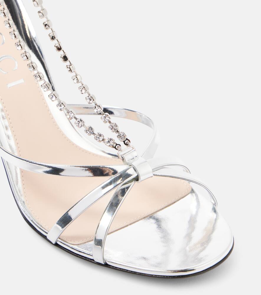 Upper: leather. Lining: leather. Sole: leather insole and sole. Toe shape: square open toe. Made in Italy. Includes: shoe box. Designer color name: Silver. Closure: ankle strap. Shop the latest Gucci High-Heel Sandals for women now.