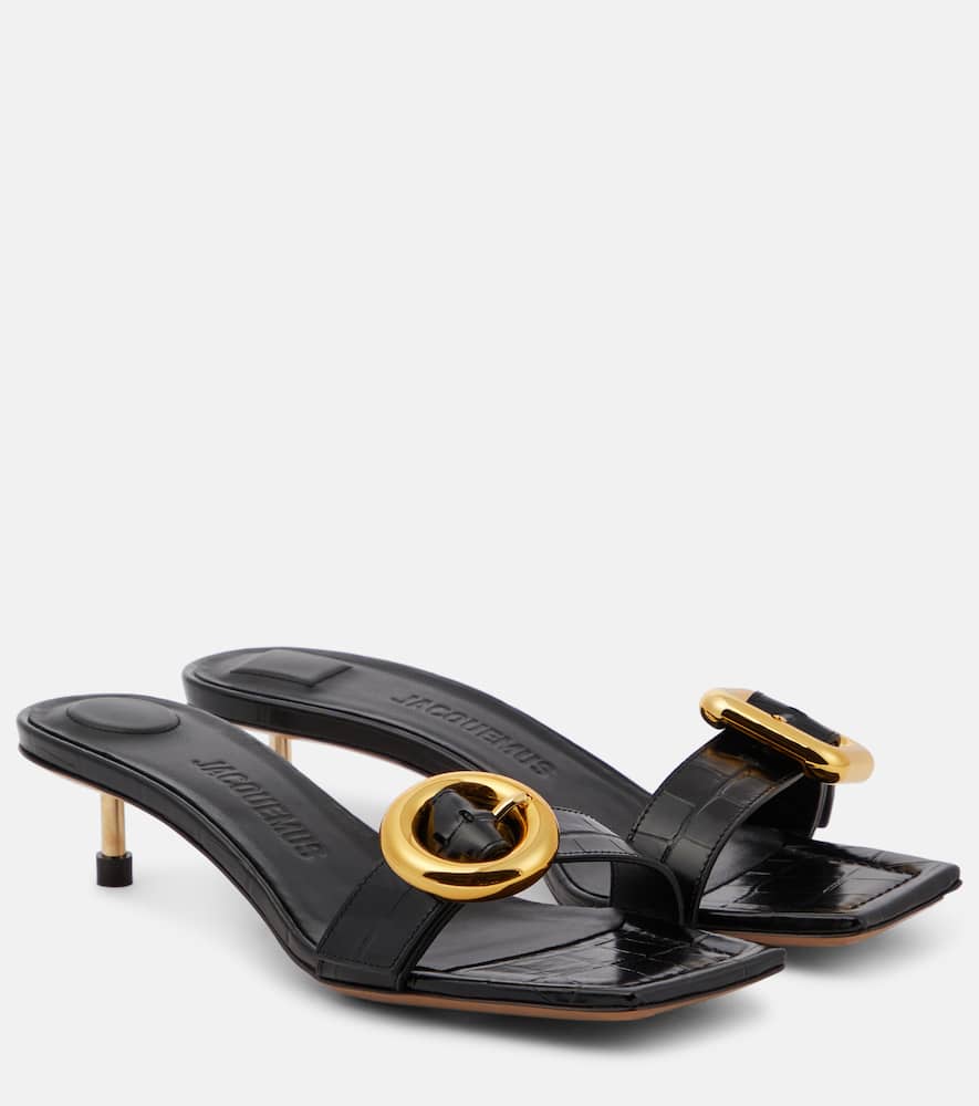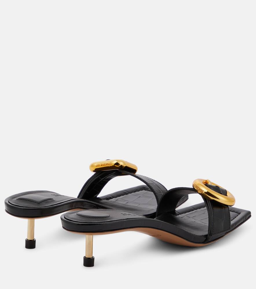 Upper: leather. Lining: leather. Sole: leather insole and sole. Toe shape: square open toe. Made in Italy. Includes: dust bag, shoe box, extra heel tips. Designer color name: Black. Shop the latest Jacquemus Mid-Heel Sandals for women now.