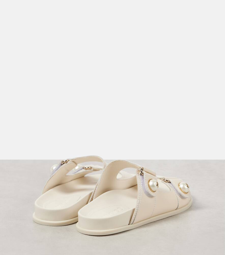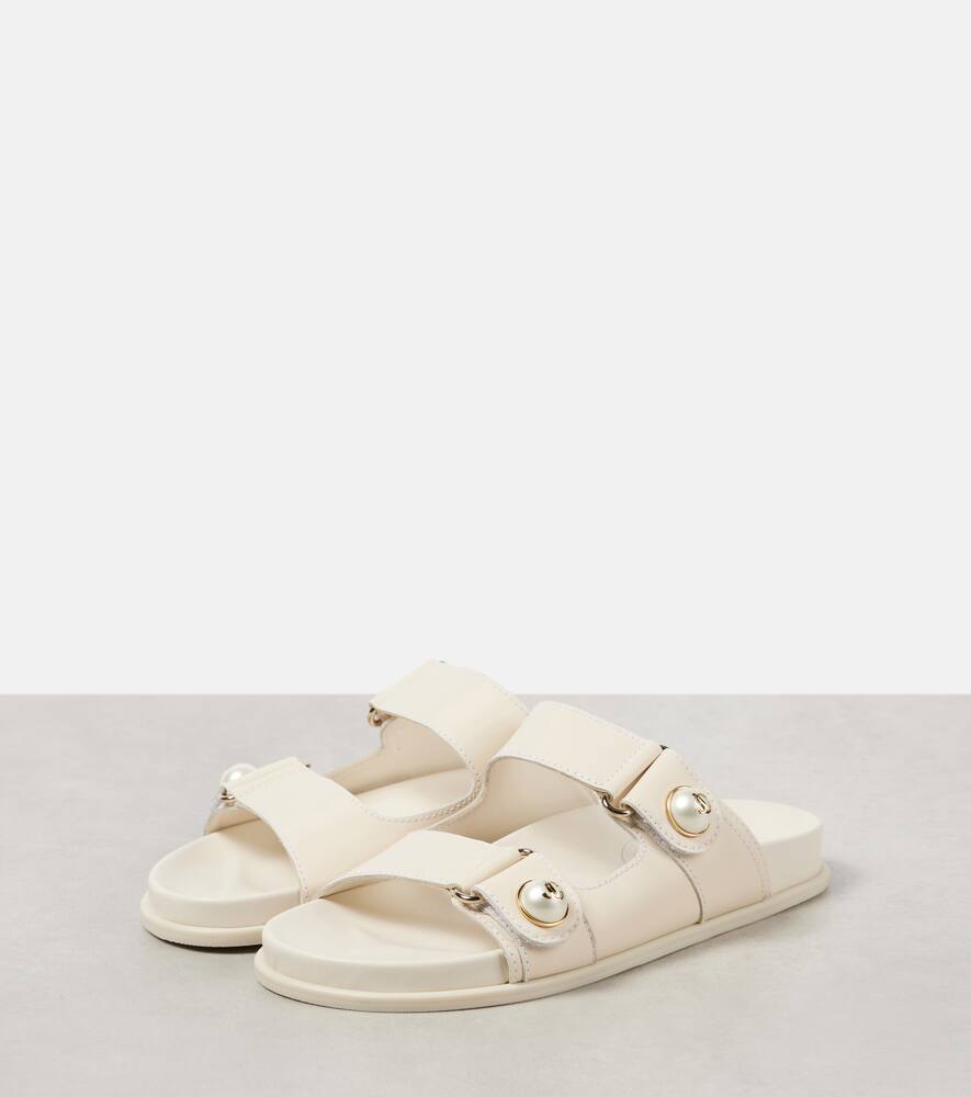 Upper: leather. Lining: leather. Sole: leather insole, rubber sole. Toe shape: round open toe. Made in Spain. Includes: shoe box, dust bags. Designer color name: Latte. Hardware color: gold. Shop the latest Jimmy Choo Slides for women now.
