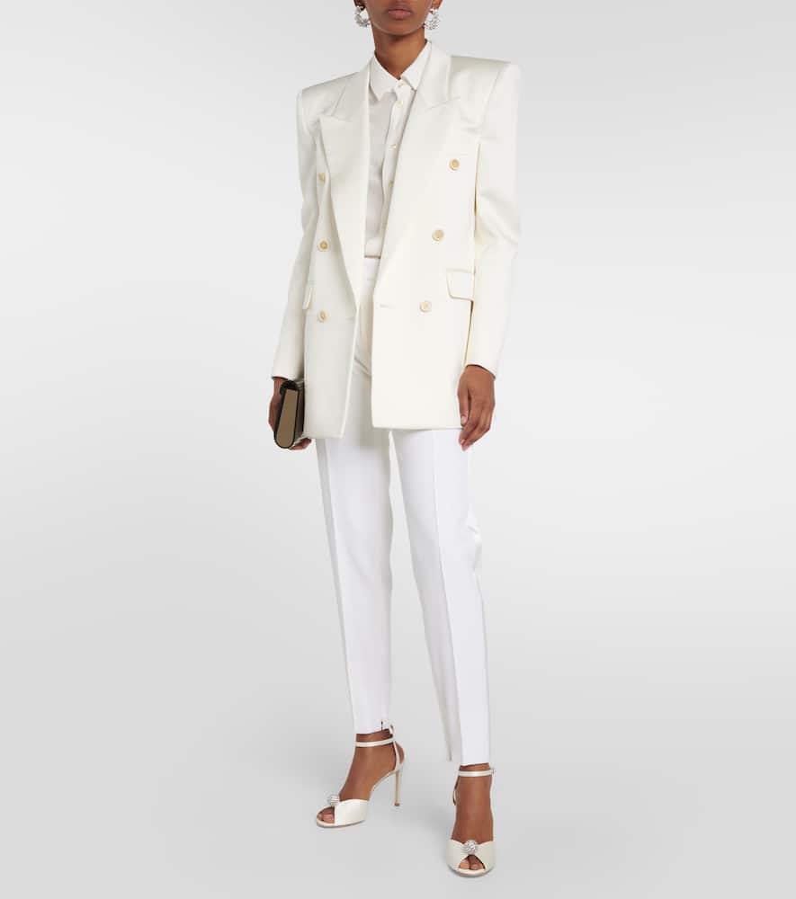 Upper: satin. Lining: leather. Sole: leather insole and sole. Toe shape: round open toe. Made in Italy. Includes: dust bag, shoe box. Designer color name: Ivory Crystal. Closure: buckle fastening. Trim: goat leather. Hardware color: silver. Shop the latest Jimmy Choo Mid-Heel Sandals for women now.