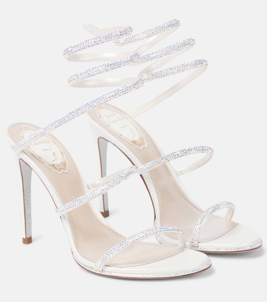 Upper: leather. Lining: leather. Sole: leather insole and sole. Toe shape: round open toe. Made in Italy. Includes: shoe box, dust bag. Designer color name: Ivory Satin/Transmission Stra. Closure: ankle strap. Details: crystals. Shop the latest Rene Caovilla High-Heel Sandals for women now.