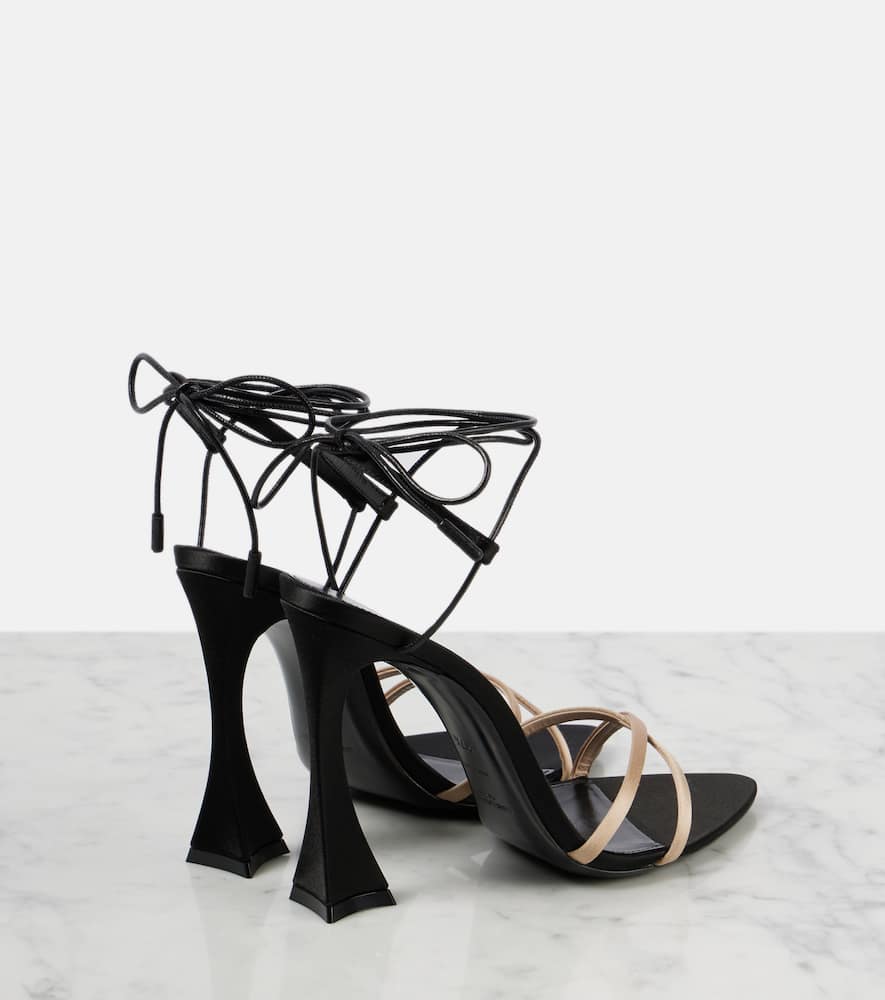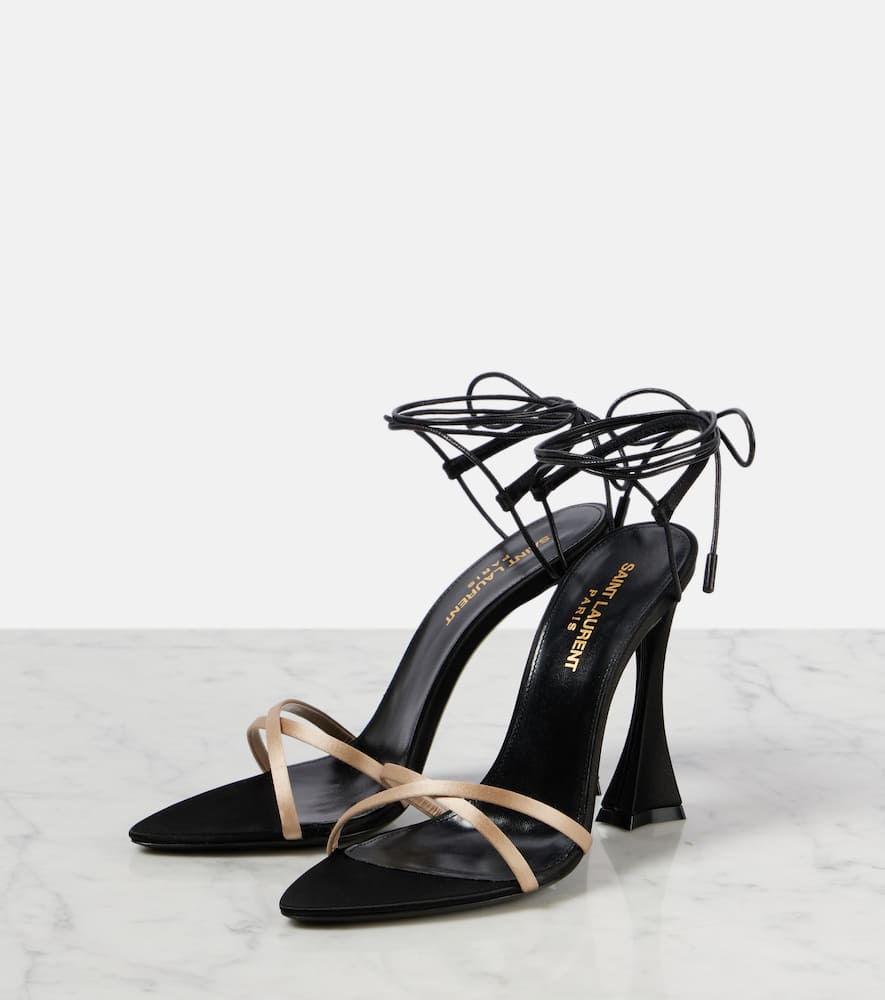 Upper: fabric. Lining: leather. Sole: leather insole and sole. Toe shape: pointed open toe. Made in Italy. Includes: dust bags, shoe box. Designer color name: Gold / Noir. Closure: ankle strap. Shop the latest Saint Laurent High-Heel Sandals for women now.