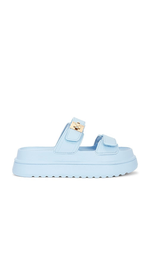 Rubber upper and sole. Made in China. Slip-on styling. Dual adjustable velcro straps. Contoured footbed. Approx 32mm/ 1.25 inch platform. SMAD-WZ1429. BIGS05S1097. The effortless west coast vibe of BB Dakota has now merged with the iconic Downtown edge of Steve Madden. Introducing Steve Madden Apparel... Inspired by confident women and its youthful New York City roots, Steve Madden apparel offers bold and disruptive, yet timeless essentials. Always at the forefront of trends and reinventing style season after season, Steve Madden apparel provides you with the tools you need to become your own fashion visionary. It's about authenticity. It's about embracing individuality. It's Steve Madden. Color: Light Blue. Shop Light Blue Platform Sandals for women and the latest Steve Madden shoes now.