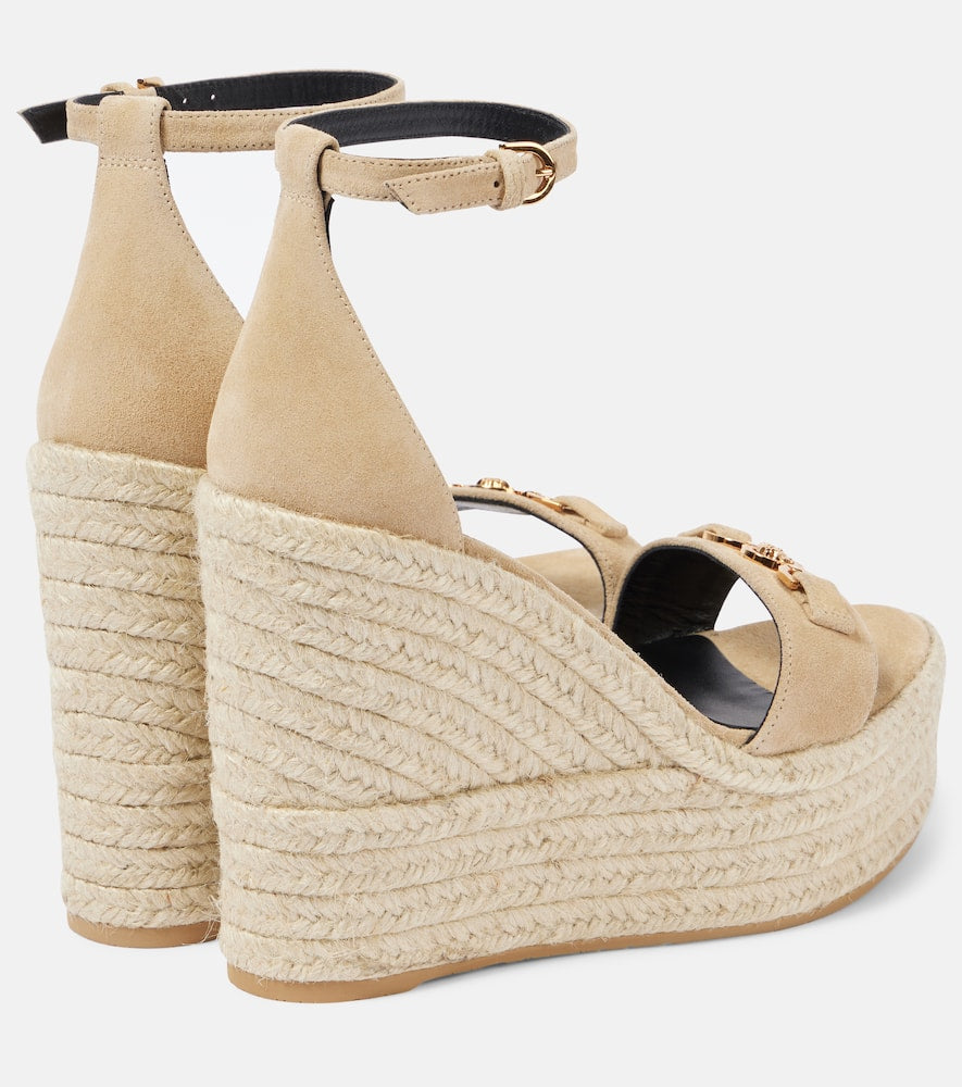 Upper: leather. Lining: leather. Sole: leather insole, rubber sole. Toe shape: round open toe. Made in Spain. Includes: dust bags, shoe box. Designer color name: Mastic-Versace Gold. Closure: buckle-fastening ankle strap. Trim: raffia. Shop the latest Versace High Espadrilles for women now.