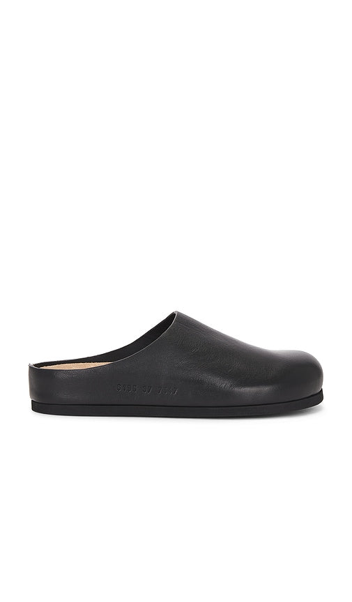 Leather upper with rubber sole. Slip-on styling. Contoured suede footbed. Leather lining. COMM-WZ66. 6195. Using only the finest materials and techniques, designers Flavio Girolami and Prathan Poopat have created a line of high-quality footwear that conveys their minimalist aesthetic and luxe appeal. Color: Black. Shop Black Clogs for women and the latest Common Projects shoes now.