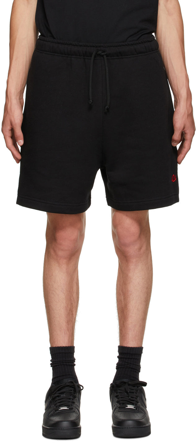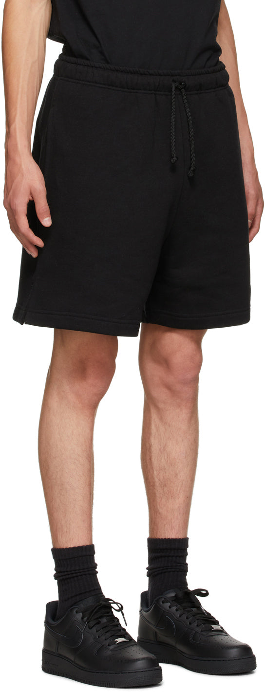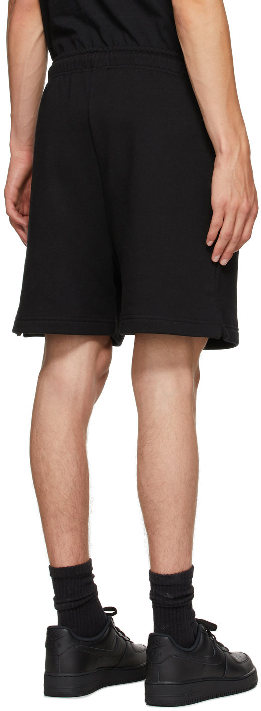Cotton fleece shorts in black. Mid-rise. Two-pocket styling. Drawstring at elasticized waistband. Logo embroidered in red at cuff. Supplier color: Black 100% cotton. Brand: 424