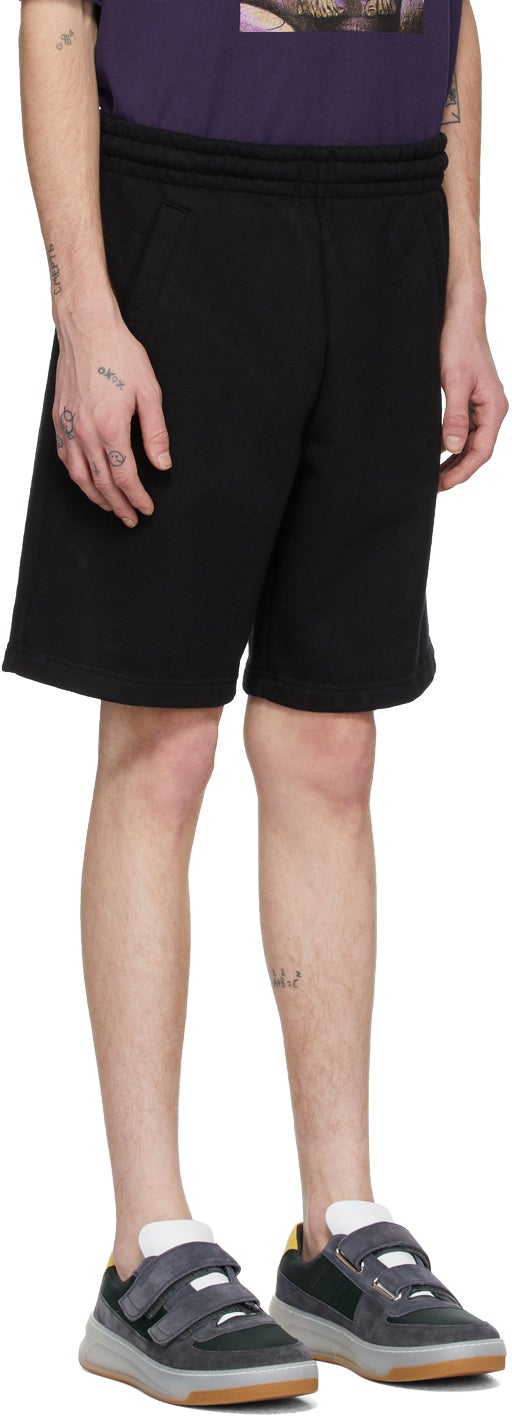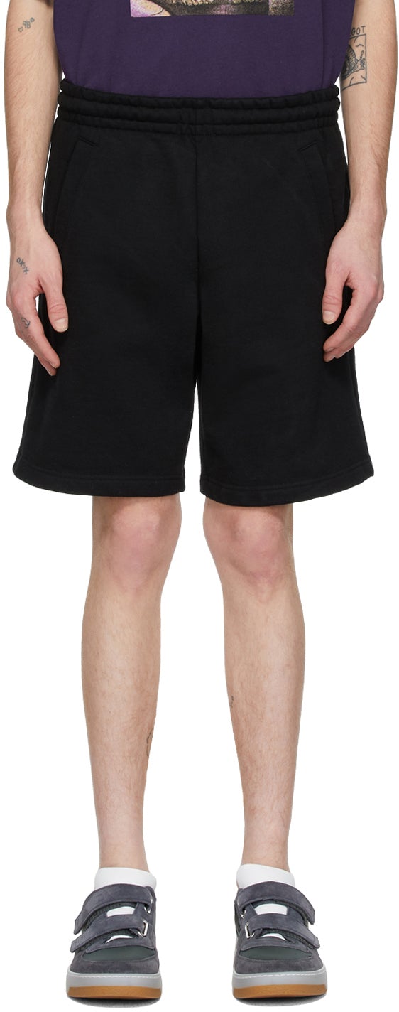 Cotton-blend fleece shorts in black. Mid-rise. Concealed drawstring in beige at elasticized waistband. Three-pocket styling. Textile logo flag in pink at back. Supplier color: Black 50% cotton, 50% polyester. Brand: Acne Studios