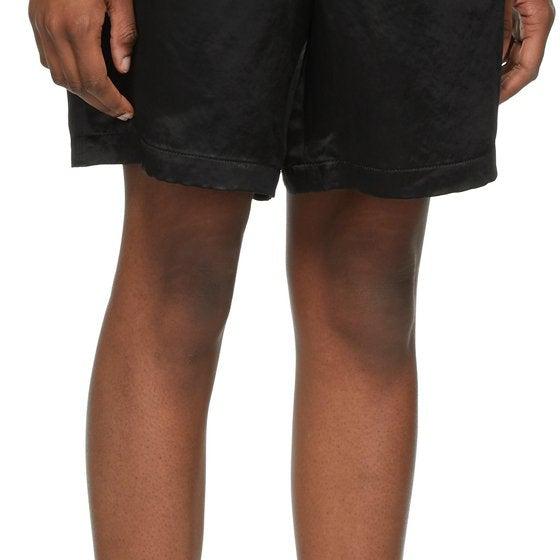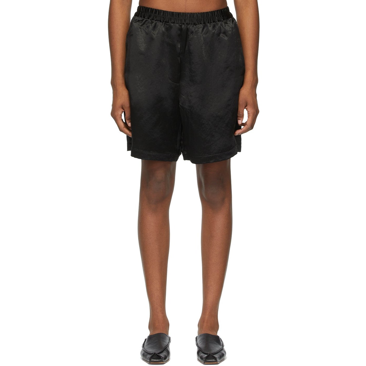 Satin shorts in black. Mid-rise. Four-pocket styling. Elasticized waistband. Mock-fly. Supplier color: Black 100% acetate. Brand: Acne Studios