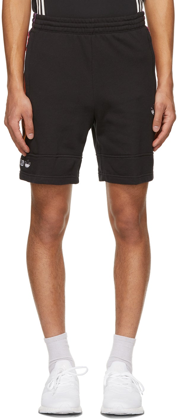 French terry shorts in black. Mid-rise. Two-pocket styling. Concealed drawstring at elasticized waistband. Logo embroidered in white at front leg and hem. Signature stripes featuring gradient pattern in purple, red, and yellow at outseams. Tonal logo-engraved hardware. Part of the SPRT collection. Supplier color: Black 100% cotton. Brand: adidas Originals