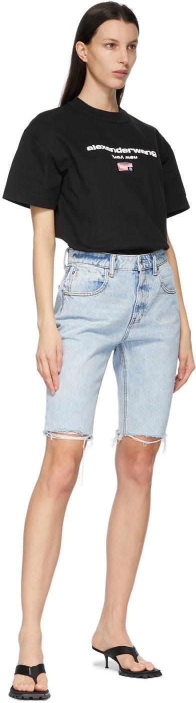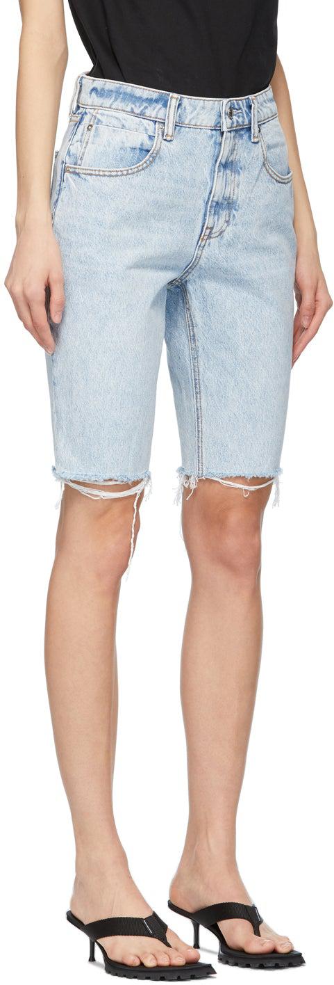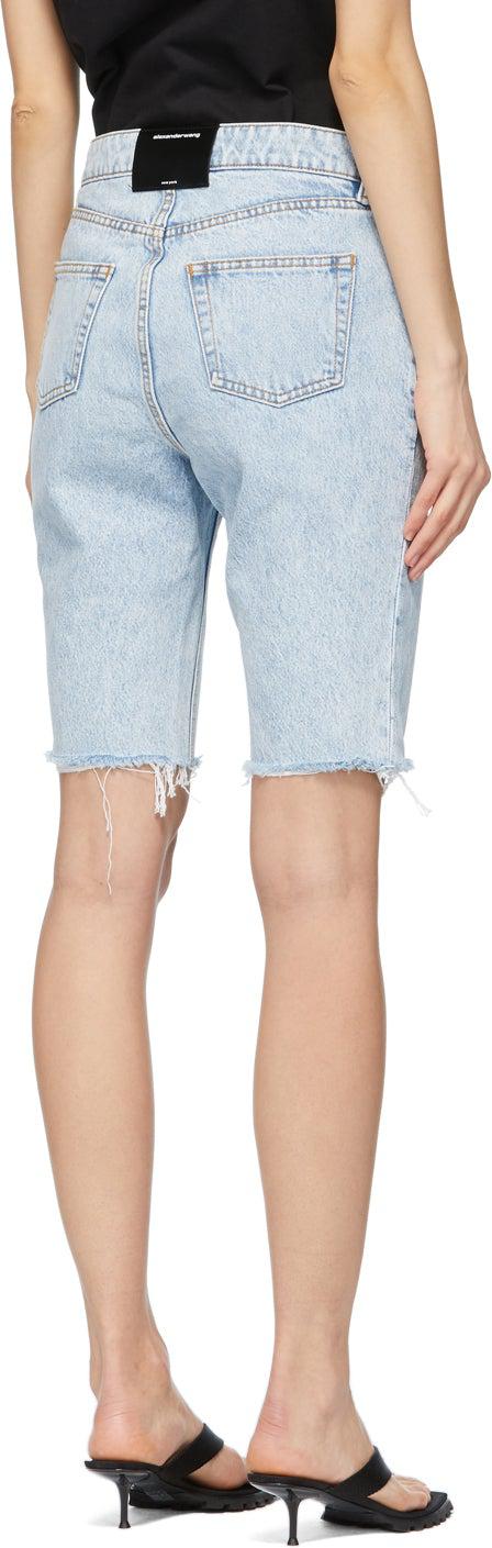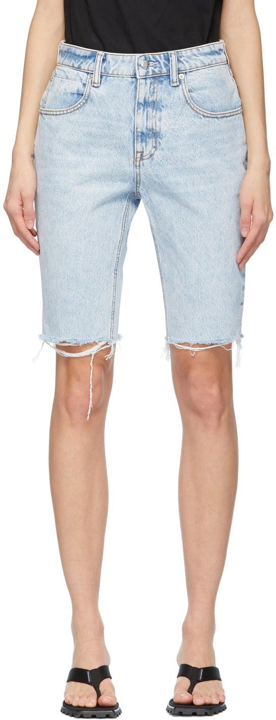 Non-stretch denim shorts in blue. Low-rise. Fading throughout. Five-pocket styling. Belt loops at waistband. Faux-leather logo patch in black at back waistband. Frayed edge at cuffs. Zip-fly. Silver-tone hardware. Contrast stitching in tan. Supplier color: Pebble fresh 100% cotton. Brand: Alexander Wang