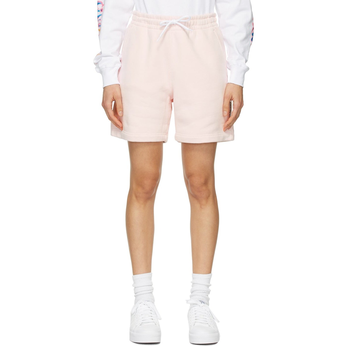Garment-washed French terry shorts in pink. Mid-rise. Two-pocket styling. Drawstring in white at elasticized waistband. Logo flag in white and black at outseam. Supplier color: Primrose Body: 100% cotton. Trim: 97% cotton, 3% elastane. Brand: Alexander Wang