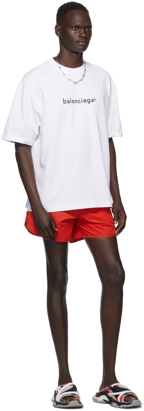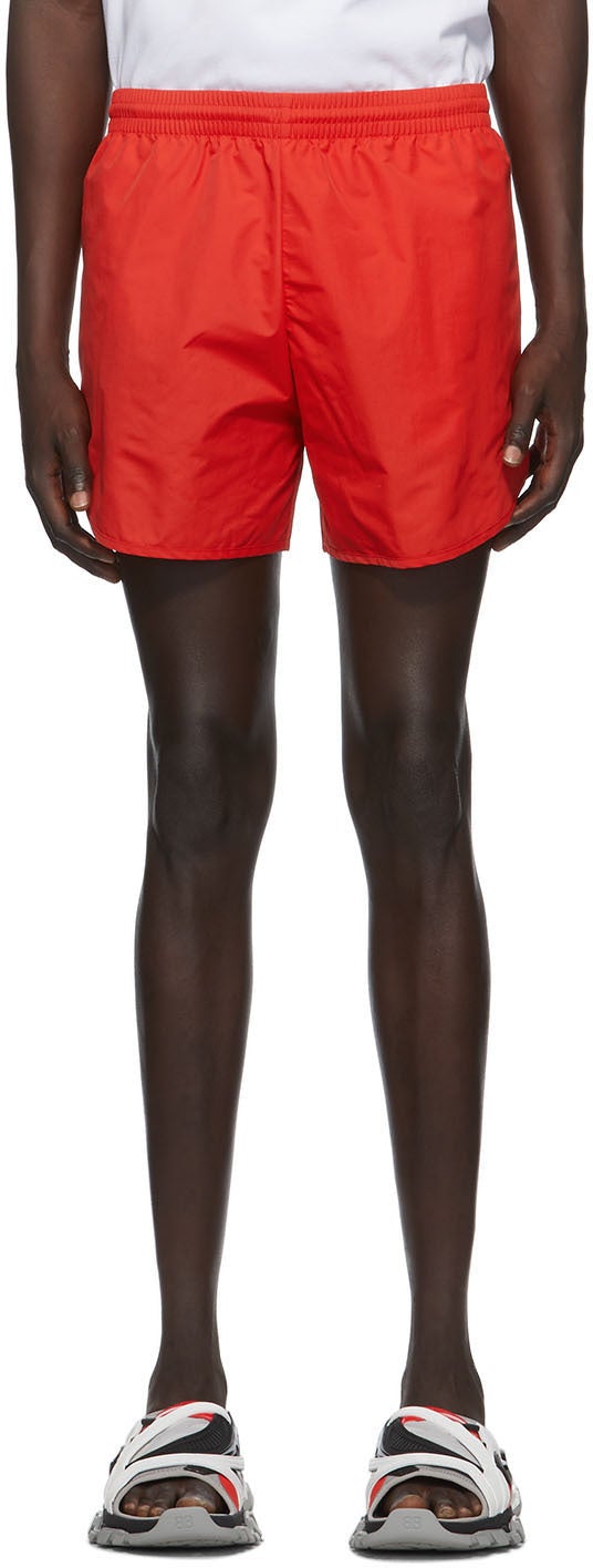 Nylon shorts in red. Mid-rise. Three-pocket styling. Concealed drawstring at elasticized waistband. Tonal logo embroidered at front. Tonal mesh lining. Tonal hardware. Supplier color: Masai red 100% polyamide. Brand: Balenciaga