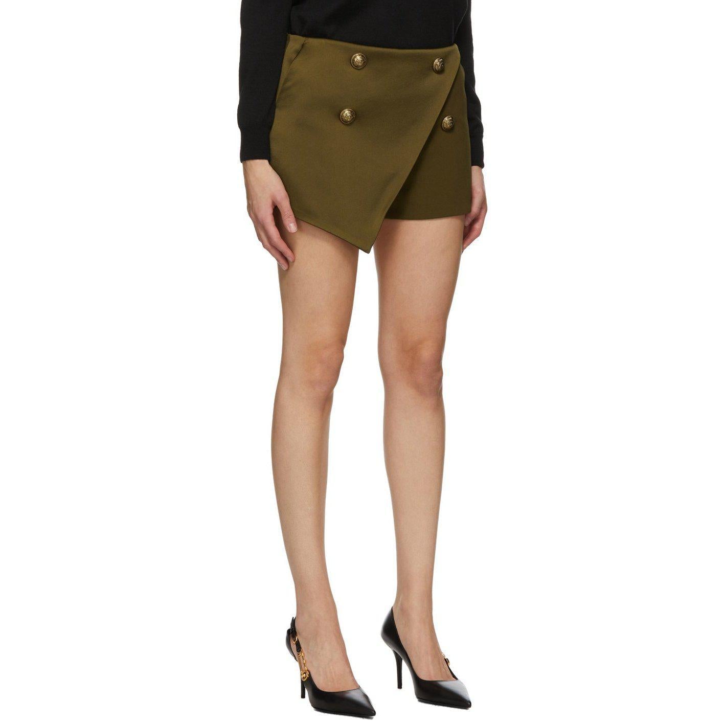 Viscose crêpe shorts in khaki. Mid-rise. Two-pocket styling. Asymmetric satin overlay panel and logo-engraved button detailing at front. Zip closure and darts at back. Fully lined. Logo-engraved gold-tone hardware. Supplier color: Khaki Body: 100% viscose. Lining: 52% viscose, 48% cotton. Brand: Balmain